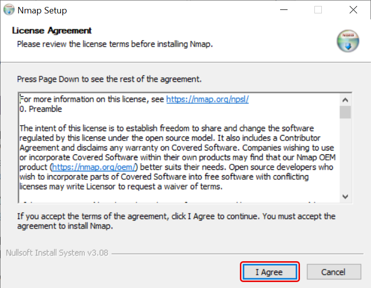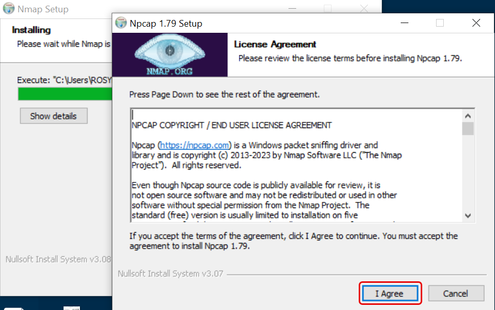 - The Npcap setup initiates as shown below. Click I Agree.