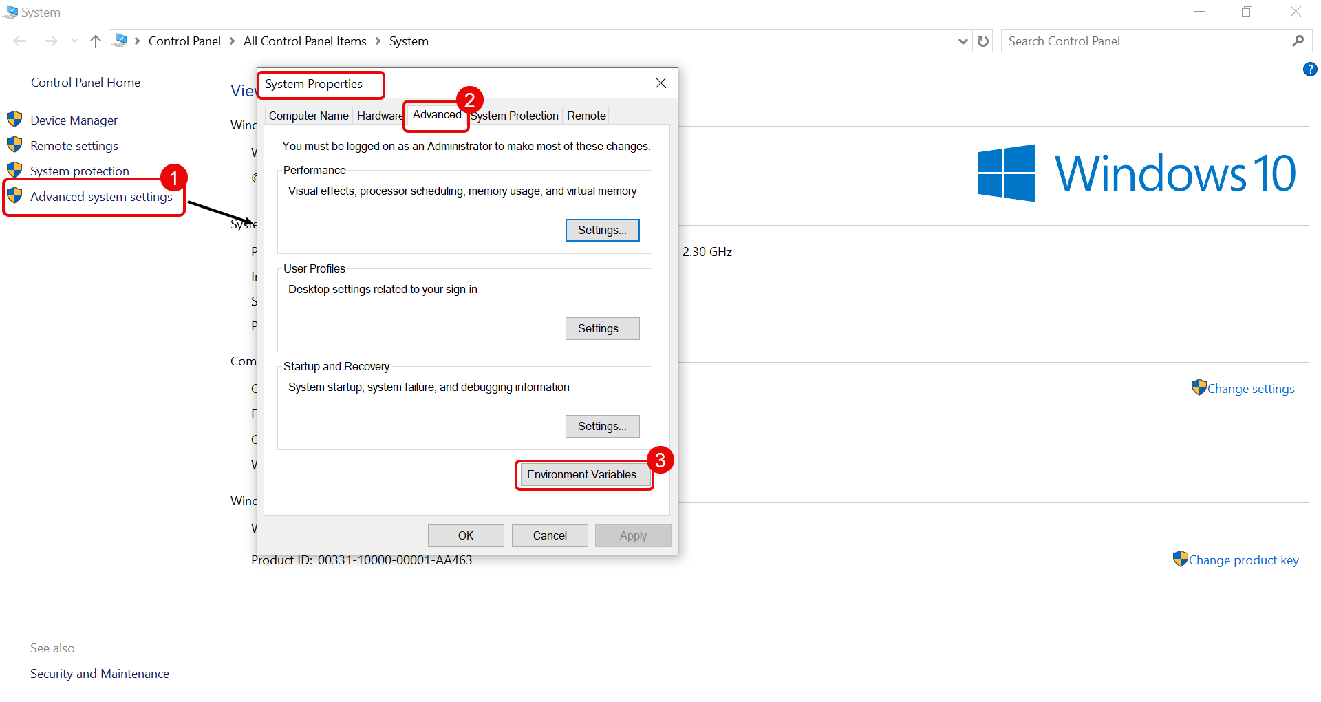 - Once the installation is complete, set the variable path in the system. To set, navigate to System Properties > Advanced System Settings > Environment Variables.