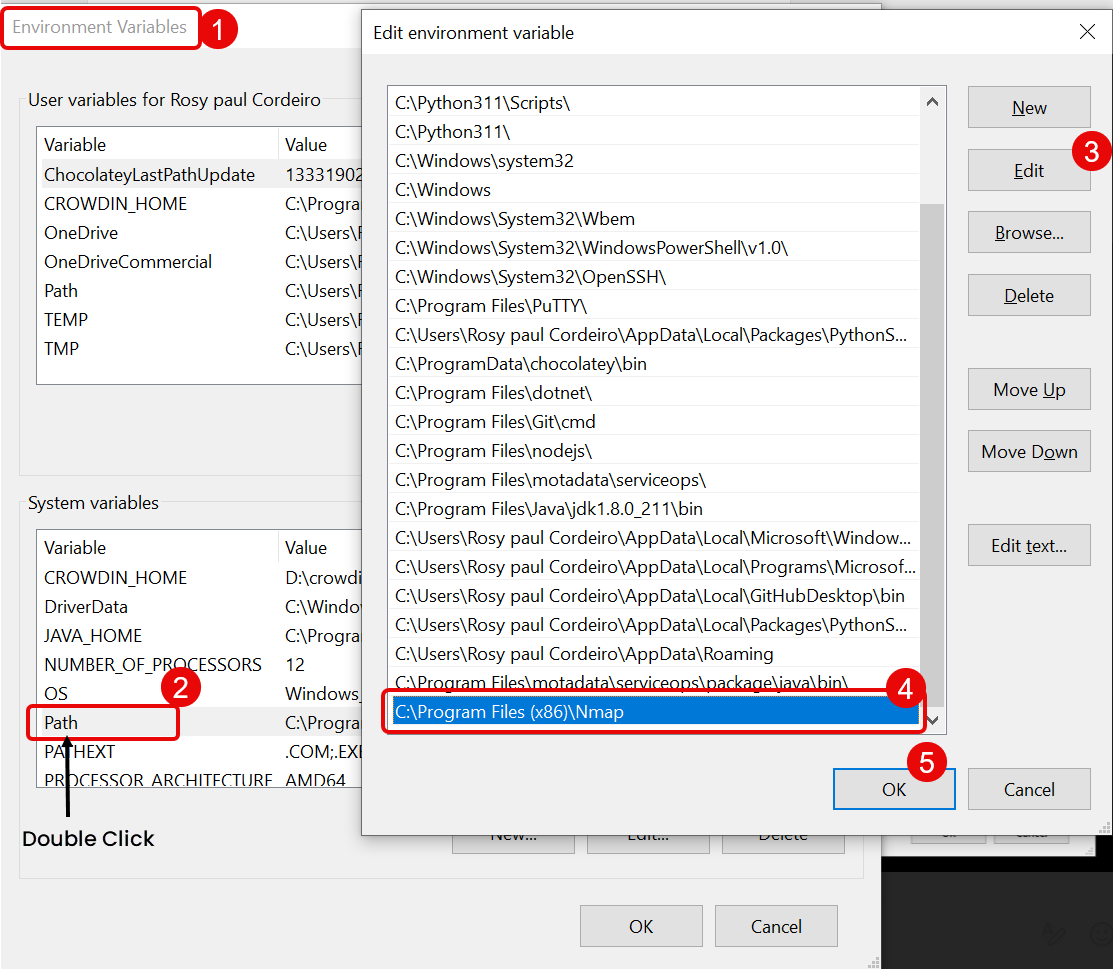 - In the Environment Variables popup, edit the Path System variable, and add a new path for the Nmap directory in it as shown below.