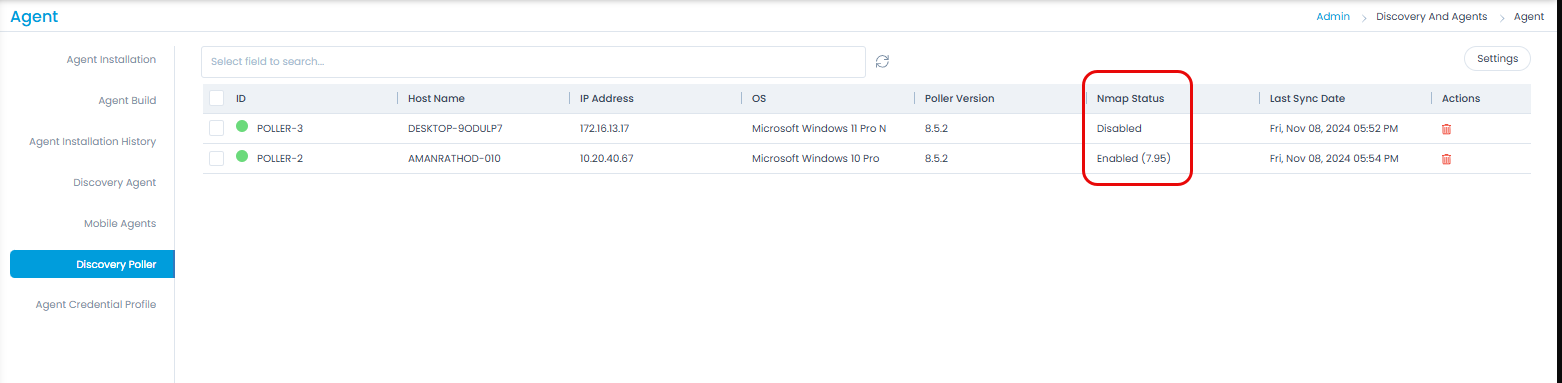 - You can view the Nmap status on the portal from Admin > Discovery and Agents > Agent > Discovery Poller page.