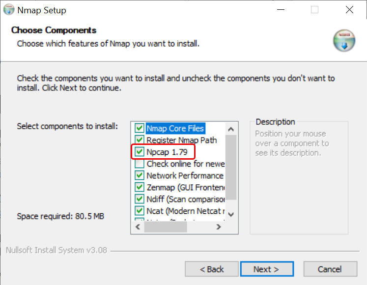 Click Next. The Npcap component must be selected.