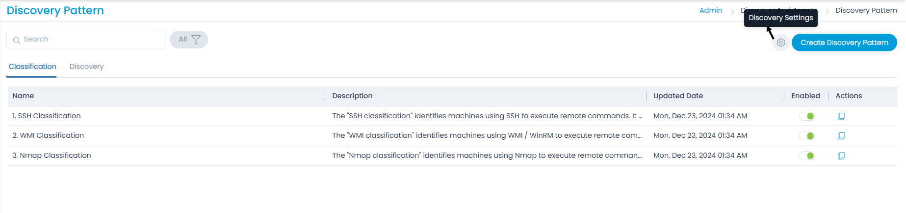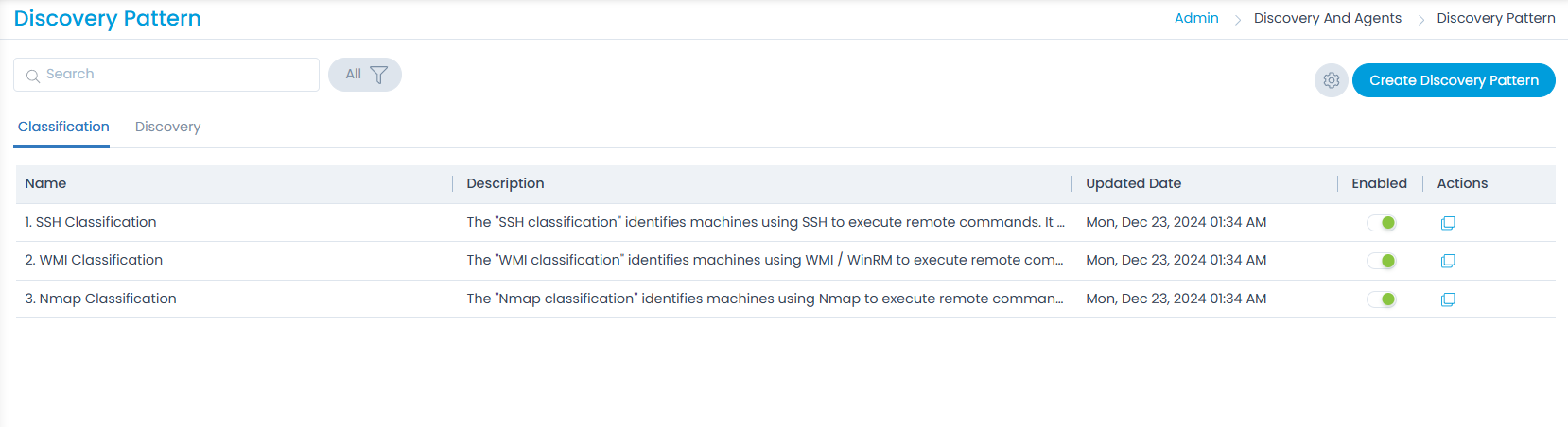 This tab displays a list of WMI (Windows) and SSH (Linux) related discovery patterns as shown below. Also, if required you can clone it or create a new one.
