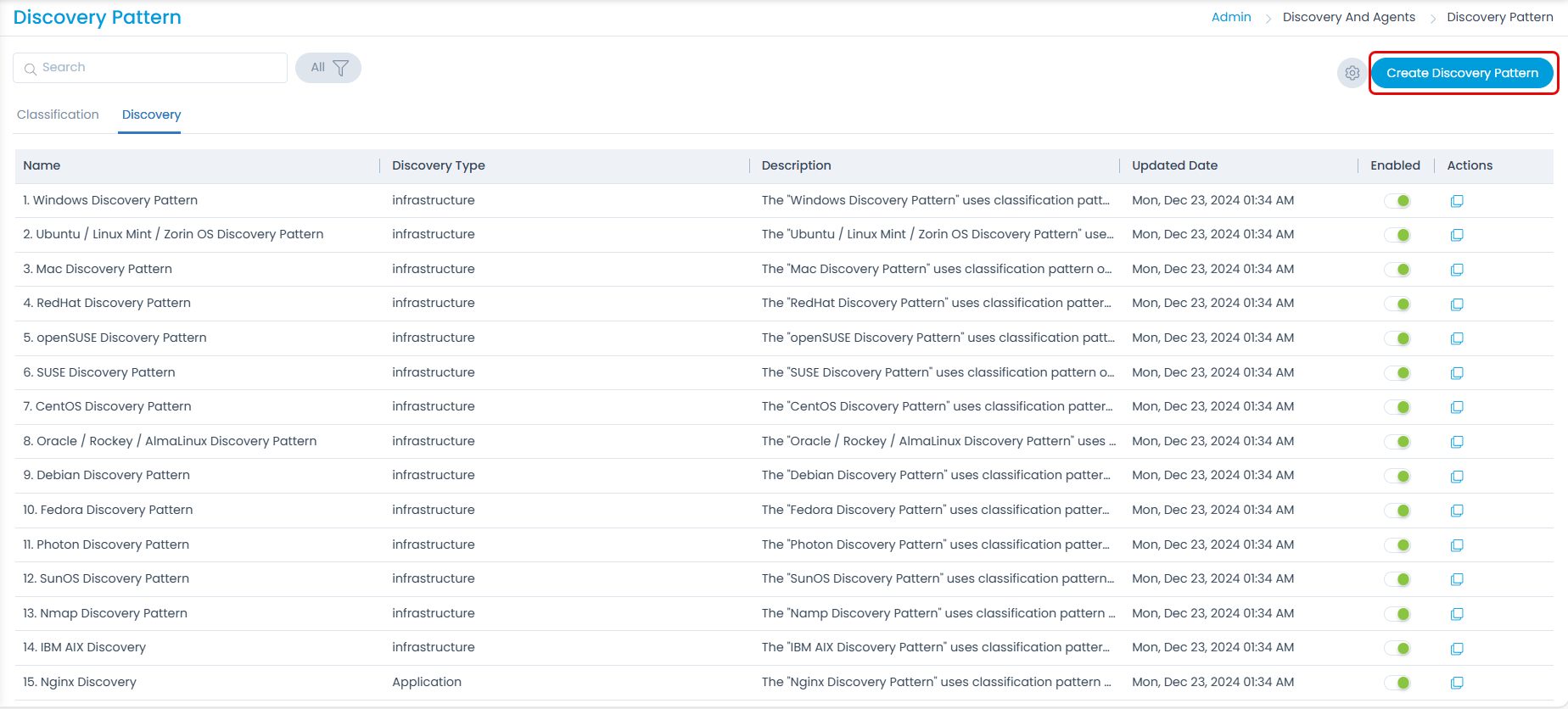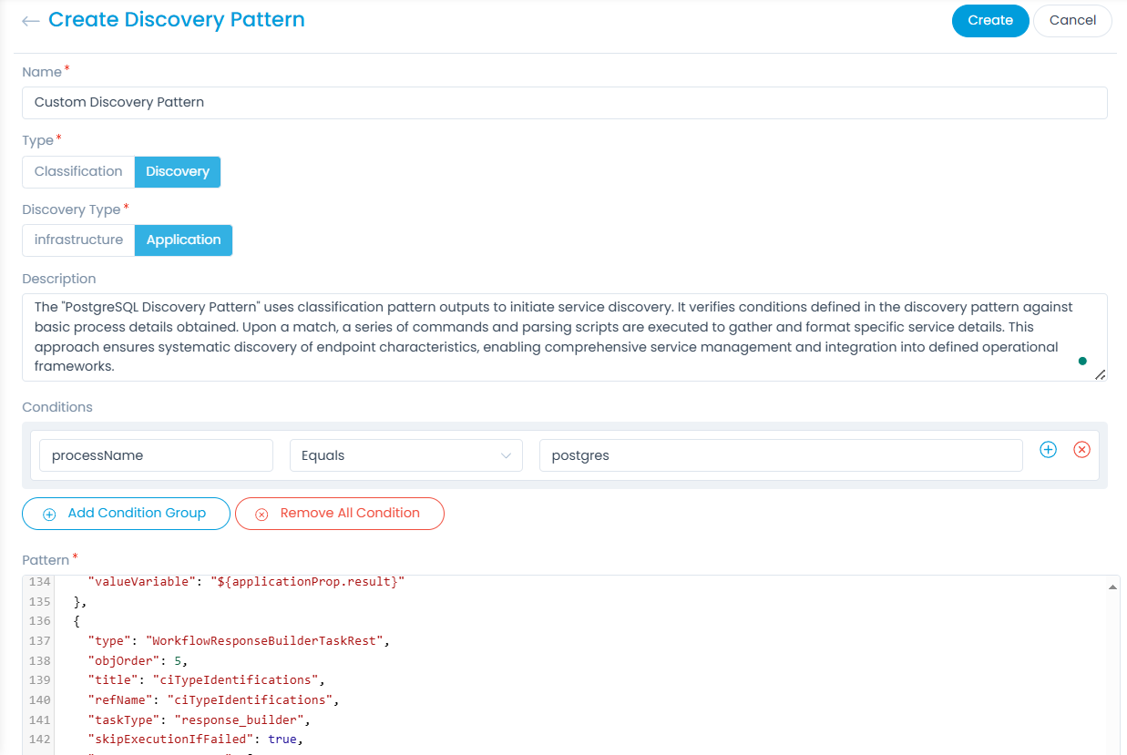 Here, you can either clone the default pattern and edit it according to your requirement or create a new Discovery Pattern using the Create Discovery Pattern button.