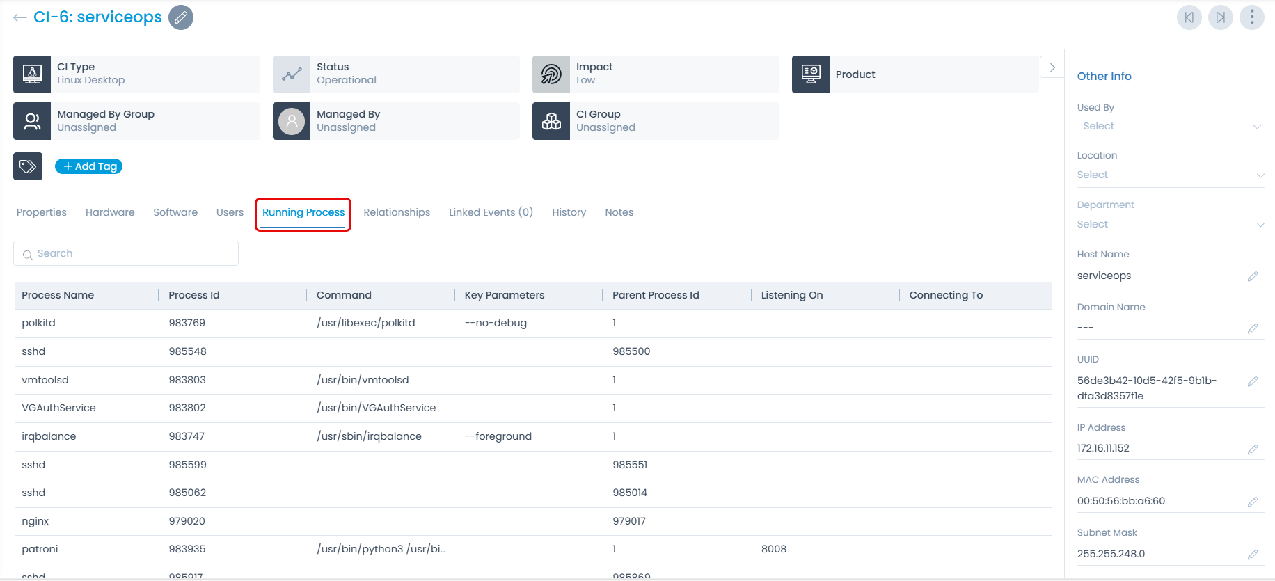 Once done, the Running Process tab will appear in the Details page of the selected CI type as shown below.