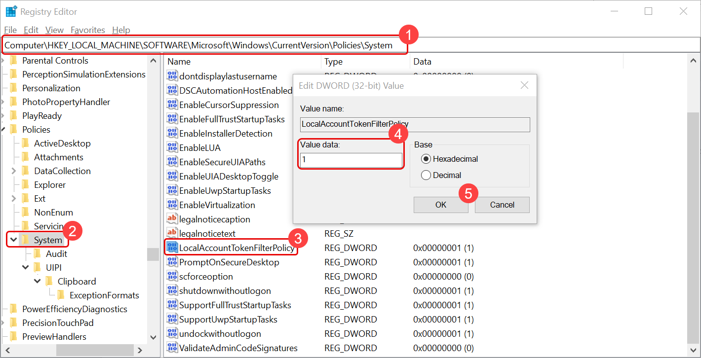 Manually by going to the path “Computer\HKEY_LOCAL_MACHINE\SOFTWARE\Microsoft\Windows\CurrentVersion\Policies\System” and setting the value of “LocalAccountTokenFilterPolicy” parameter as “1”.