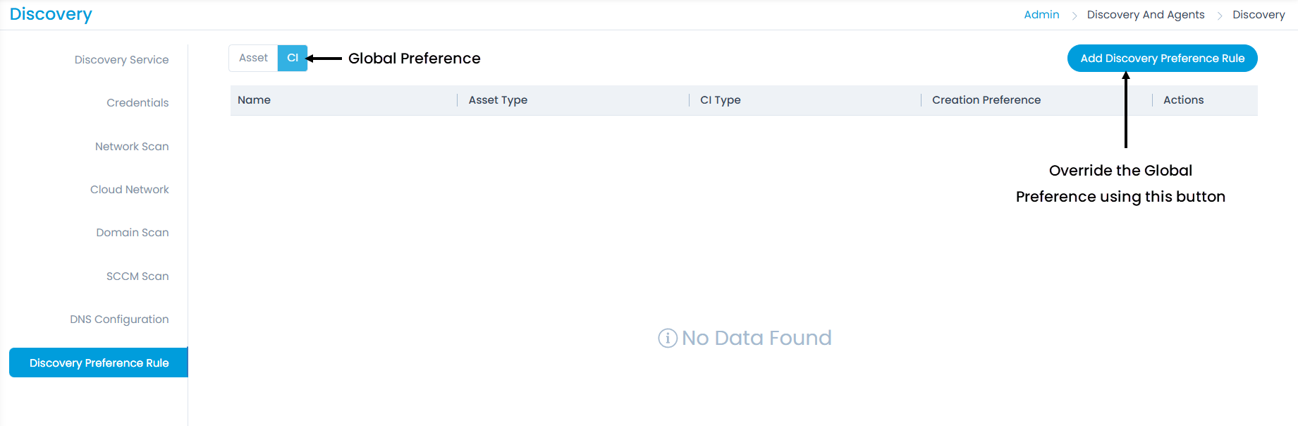 This enables to create rules based on which the asset or CI will be created at the time of discovery. Here, you can set the global (default) discovery preference and also create rules to override it.