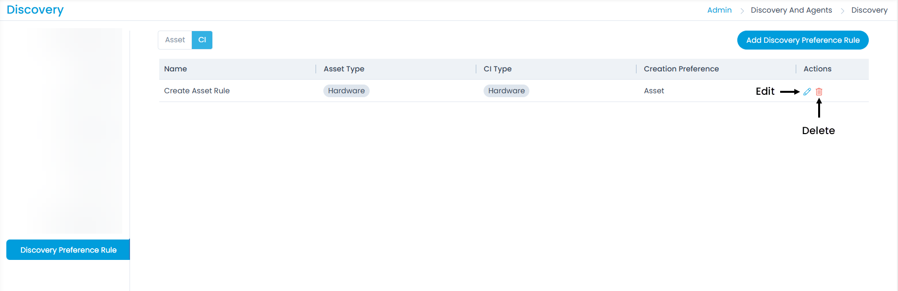 - Override the global preference: If you prefer not to modify the global preference but want to override it, you can create a separate rule by using the 'Add Discovery Preference Rule' button located at the top-right corner of the section. For example, the global preference is set as CI and you want to override it. You can create a rule that will create an Asset on discovery.