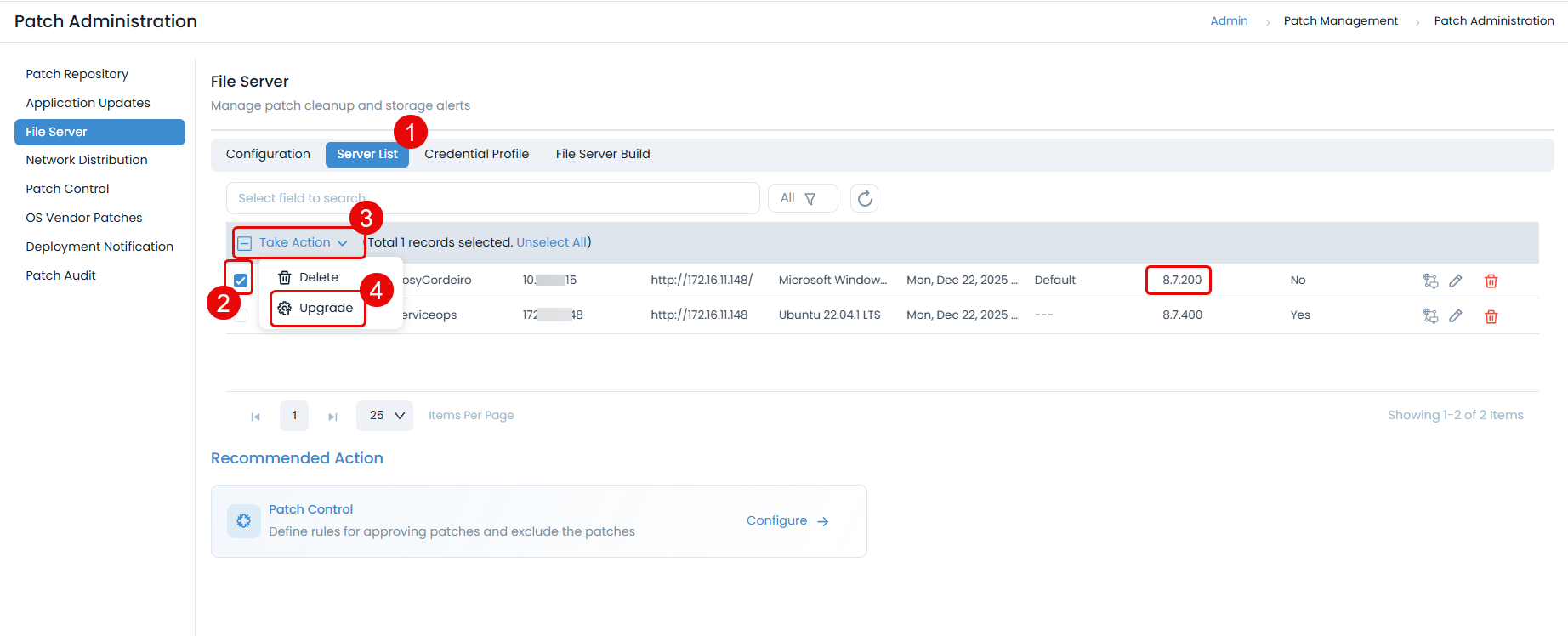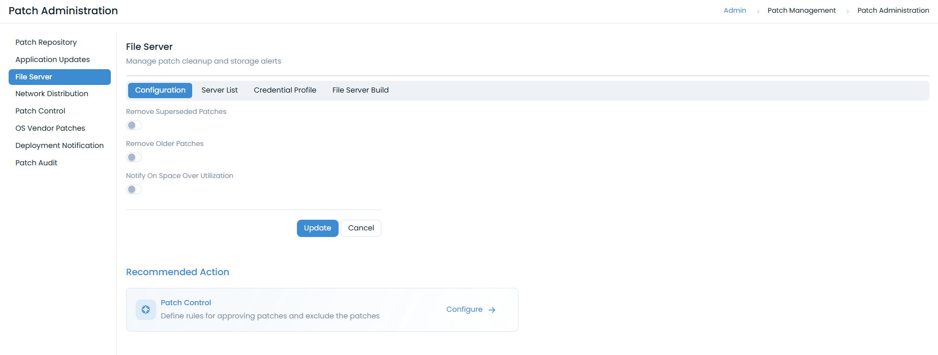 Register, secure, and manage file servers used for patch storage, distribution, and upgrades.