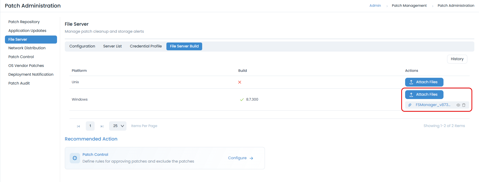 - File Server Build: Enables to upload the file server packages with builds supported from v8.6.4 onwards.