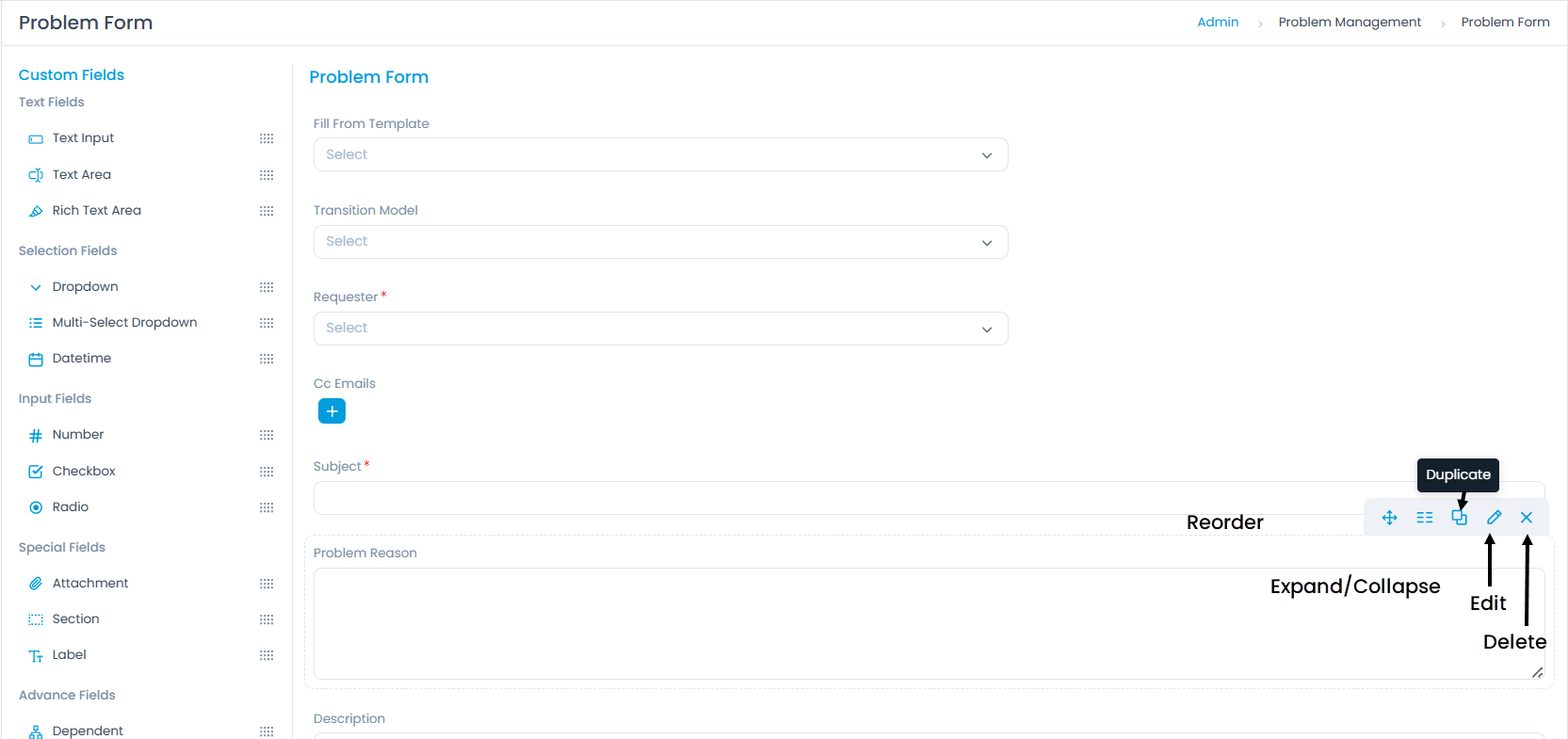 The Field Pallet (located on the left sidebar) provides a variety of custom field types that you can add to your problem form. To add a new field, simply drag and drop the desired field type from the pallet onto the form canvas.