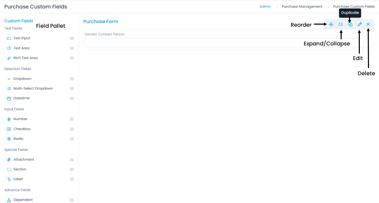 - Custom Fields: These are additional fields that can be added to the purchase form from the Field Pallet. Custom fields provide flexibility to meet specific organizational needs. They can be renamed, modified, and deleted as required.