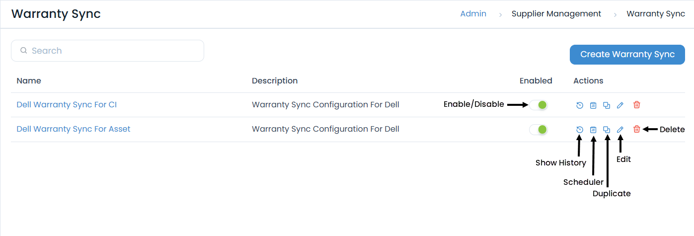 - Search: You can search for the required warranty sync configuration by name.