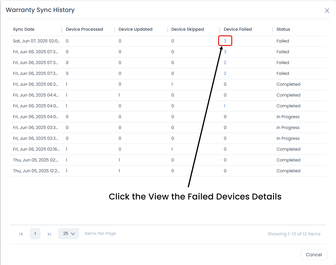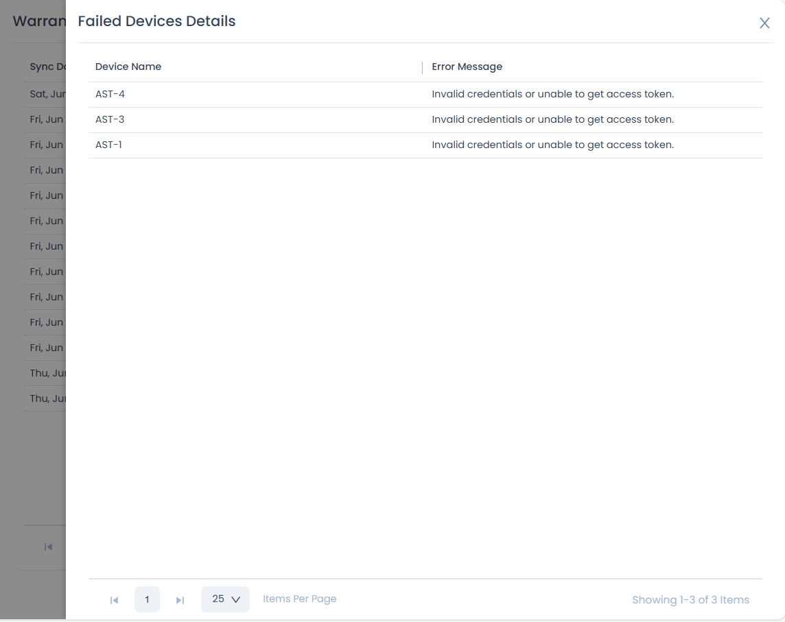 Displays the history of the warranty sync status. It displays details like Sync Date, Device Processed, Device Updated, Device Skipped, Device Failed, and Status.