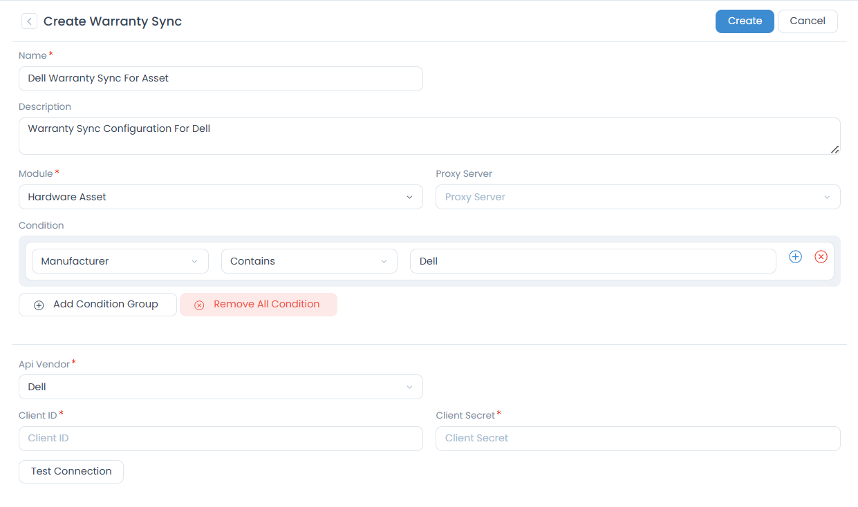 Once done, click Create to add the warranty sync configuration or cancel to stop the process.