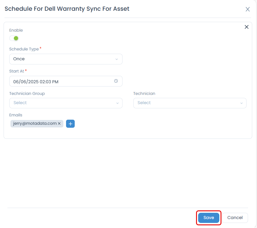 - Module: Select the target module where the warranty sync will apply (e.g., Assets or CIs). This is a required field.