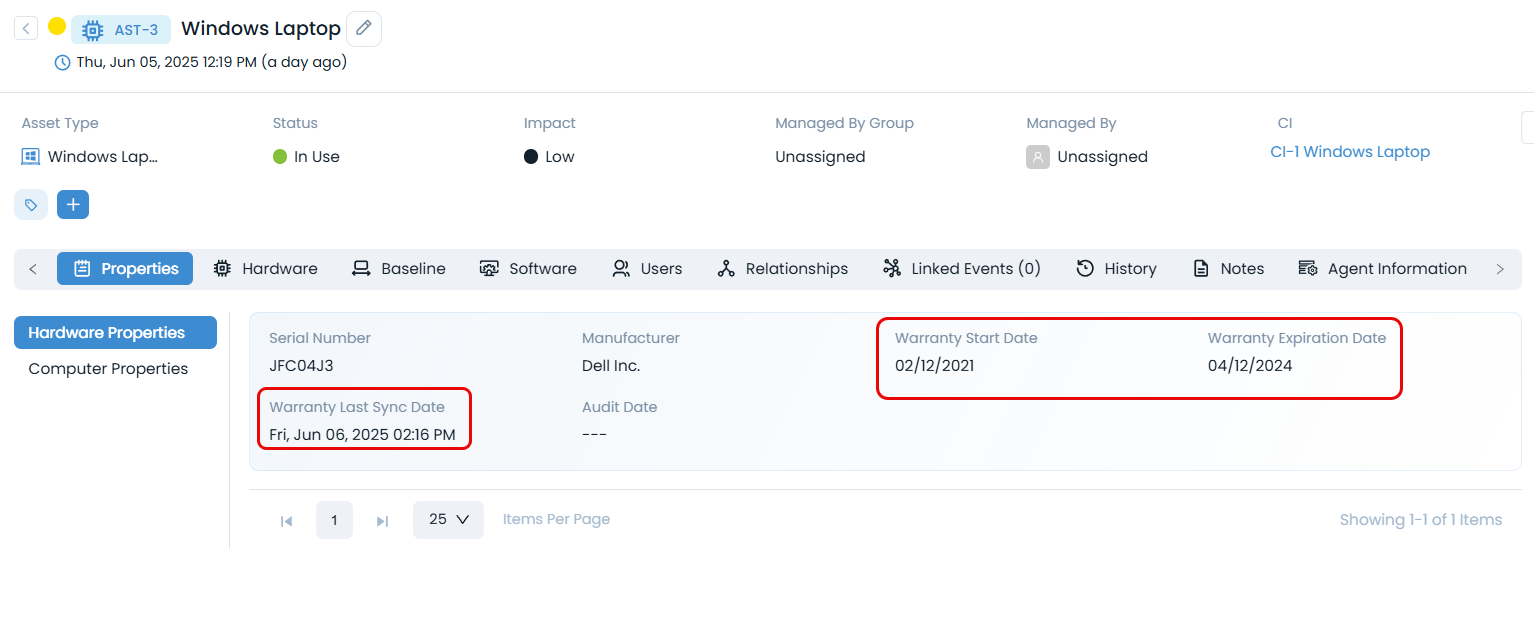 Once executed, if the scheduler runs successfully, the warranty details will be fetched and updated in the Hardware Properties of Asset and CI Details page. Also, its history will in the Show History popup.