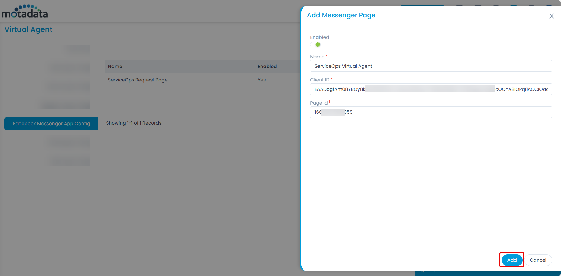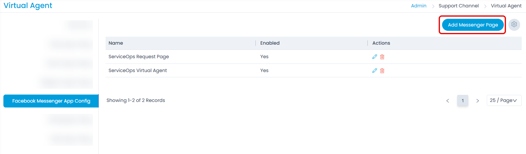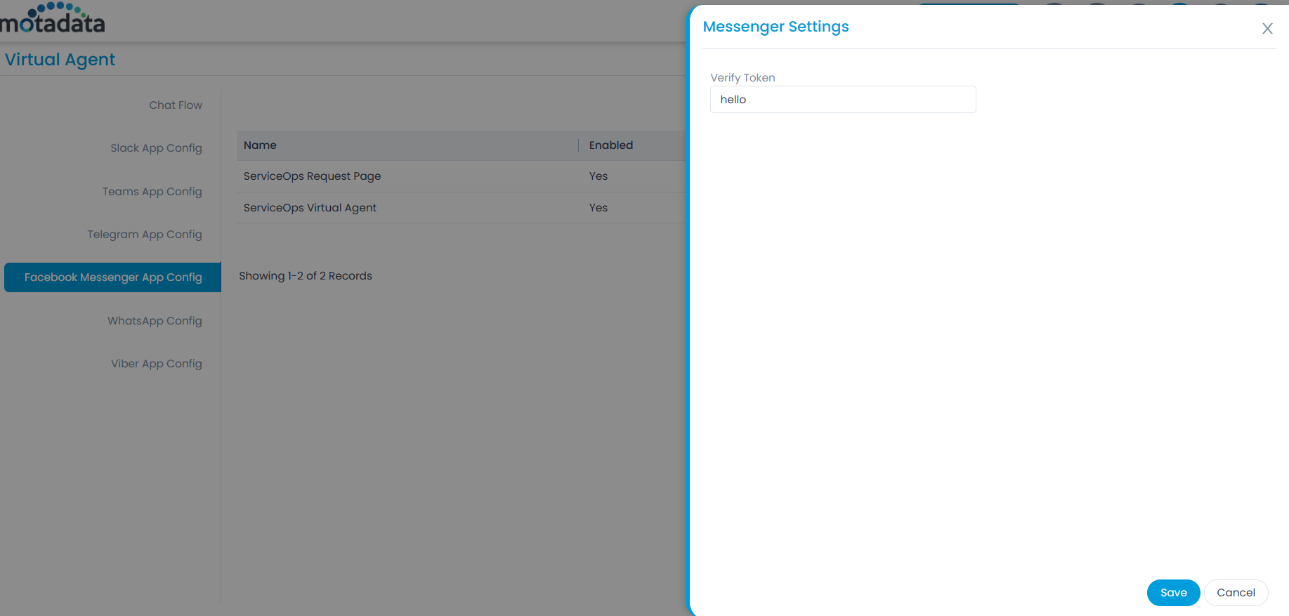 Step 26: In the ServiceOps Portal, navigate to the Admin > Support Channel > Virtual Agent > Facebook Messenger App Config tab.