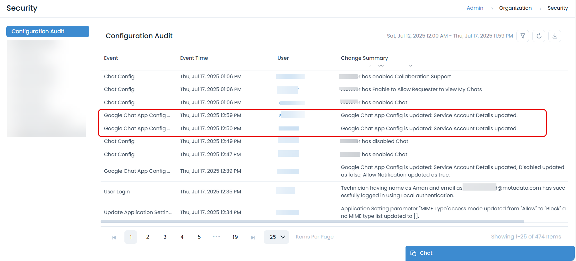 All configuration changes made in the Admin settings described above will be logged in the Configuration Audit log.