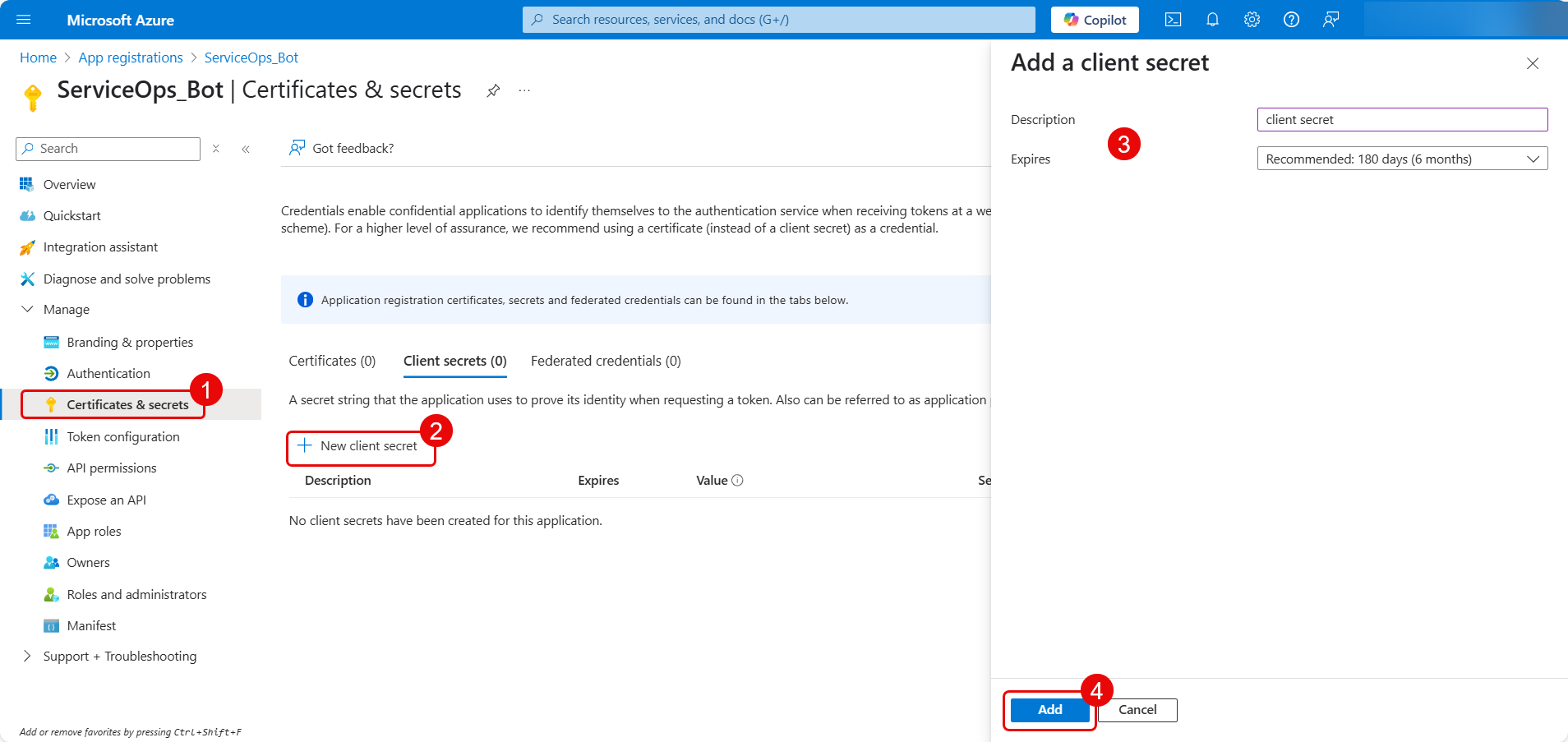 - Navigate to Certificates & secrets, click New client secret, add description and expiry if required, and click Add.