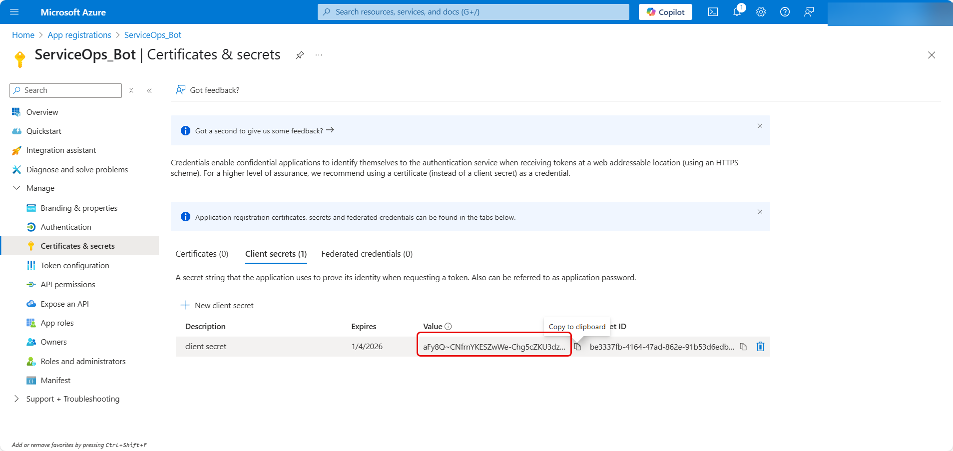 The client secret will appear. Copy the value and paste it as Password in the ServiceOps Teams Configuration page.