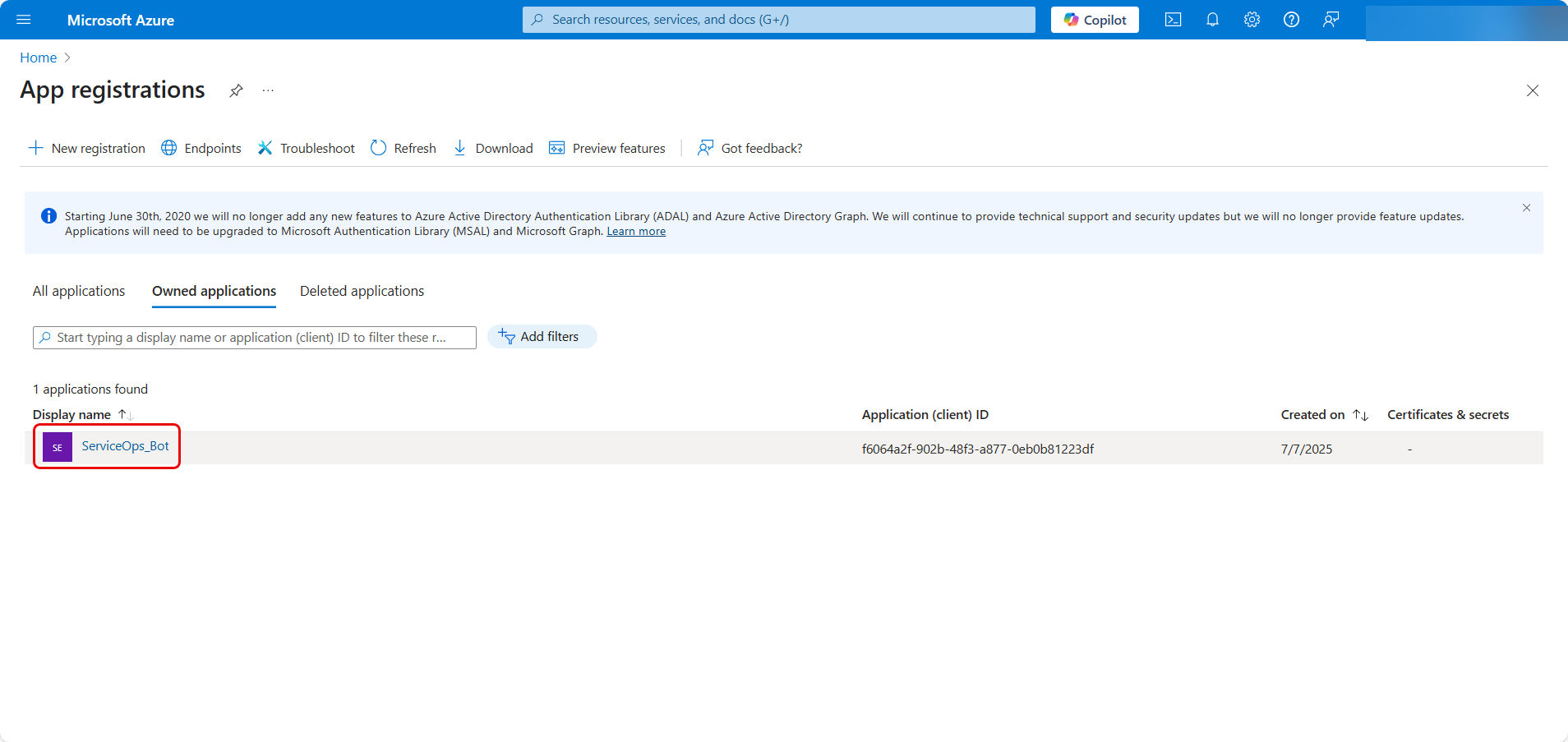 Set scopes to include Personal, Team, and Group Chat. Click Save. The bot will appear in the Bot management as shown below. Here, copy the Bot id and paste it in the Client Id field of ServiceOps.