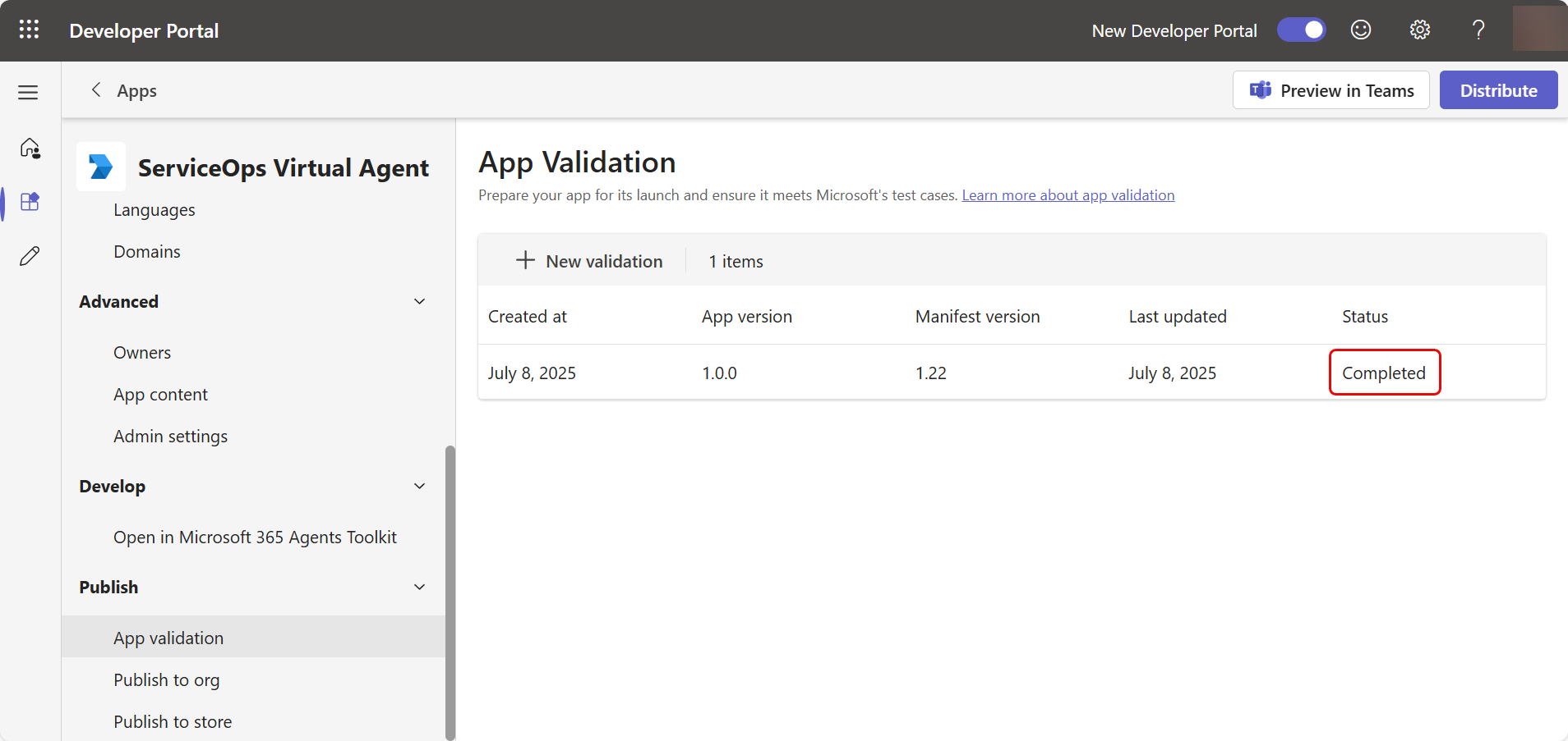 - Publish the App, In the Teams application, open the created application, navigate to Publish > App validation.
