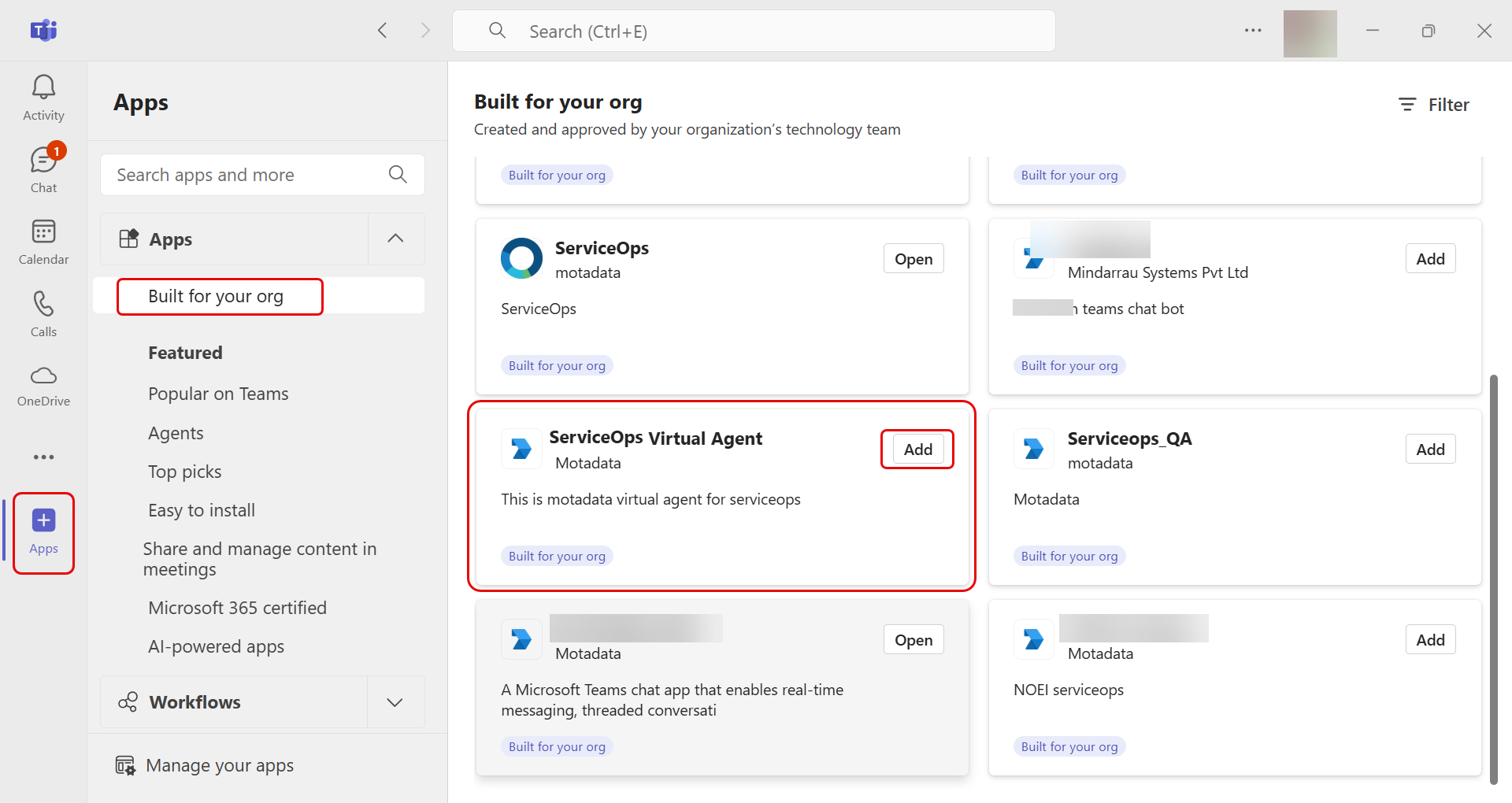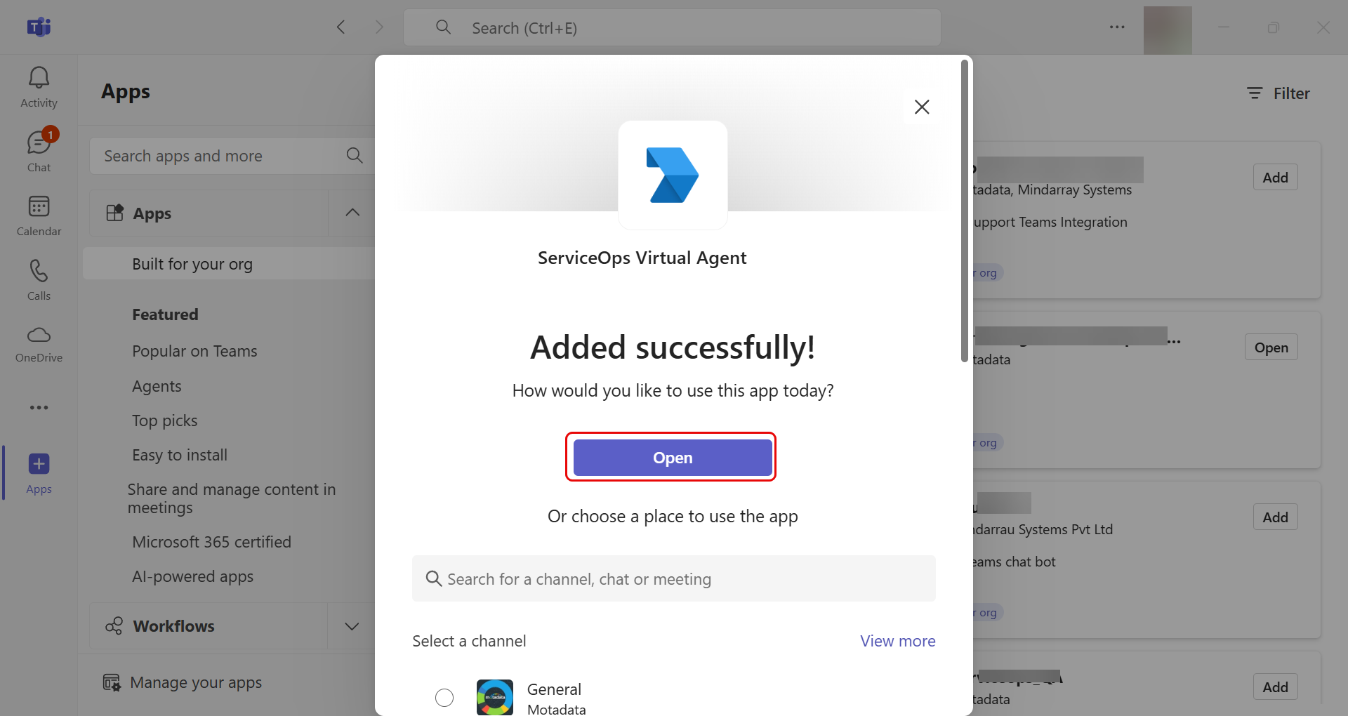 Once done, a request will be submitted to the IT Admin to publish the App. Once approved and published, it will appear in the apps list, as shown below. To approve the app, refer to the Upload a Custom App using Teams Admin Center link.