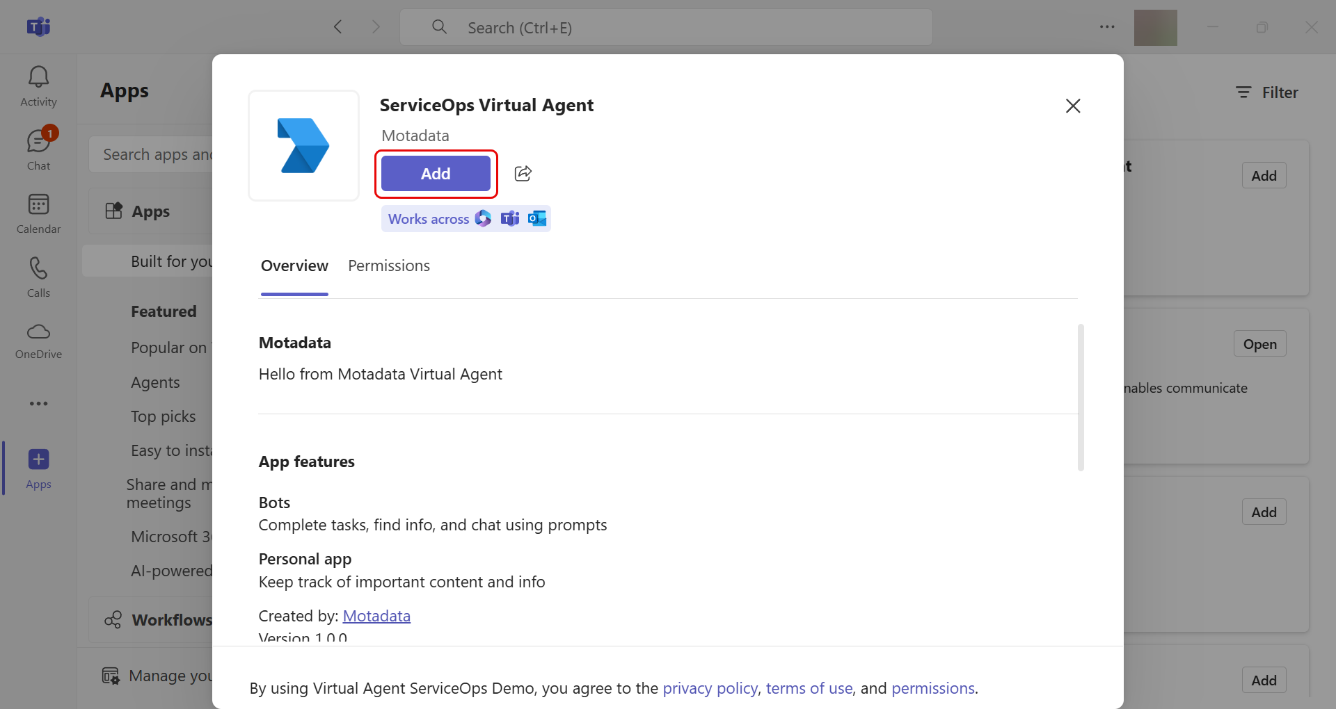 Step 5: Enter the App name and click Add. Here, the Motadata Virtual Agent app is created.