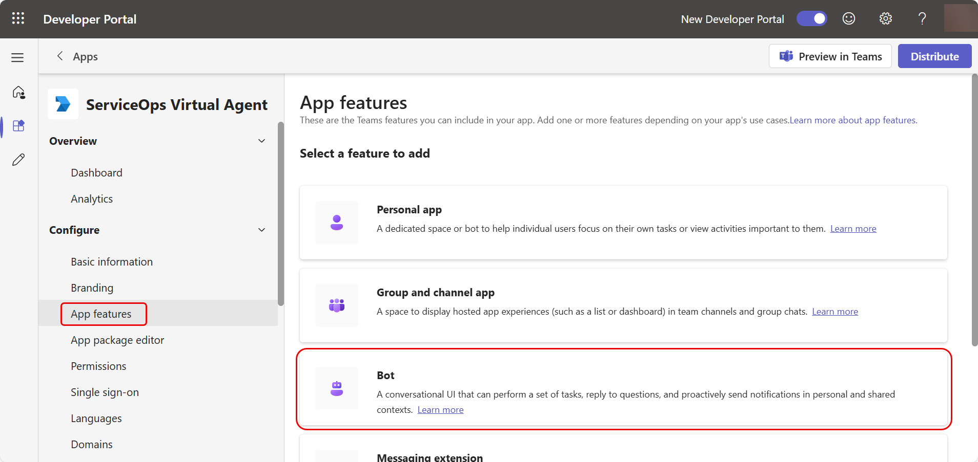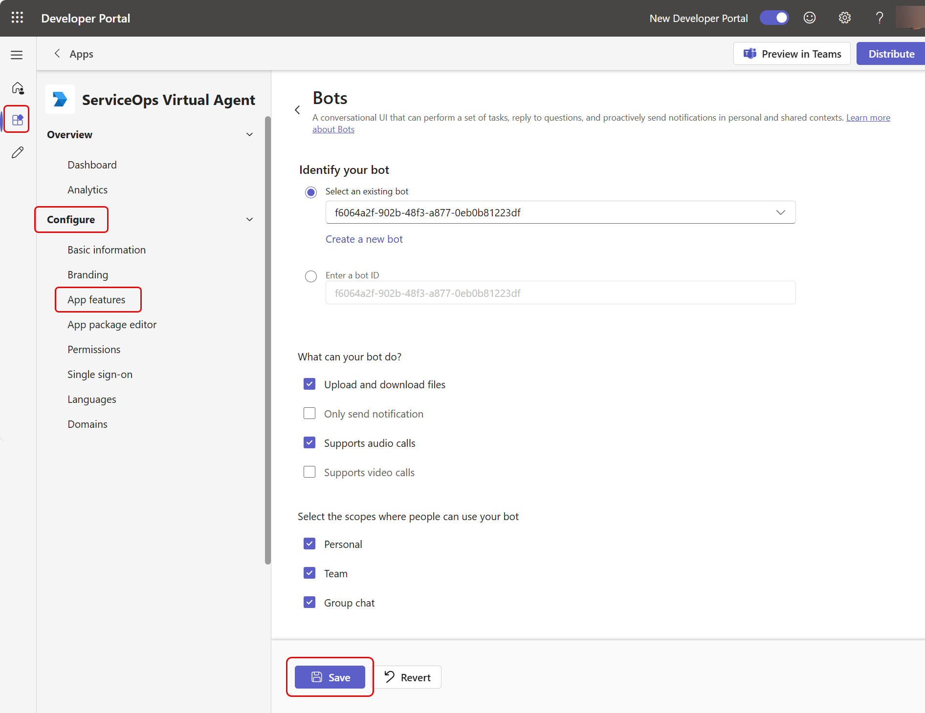 Now, go back to Apps > App Name (here, ServiceOps Virtual Agent) > Configure > App Features > Bot and select the created bot as shown below.