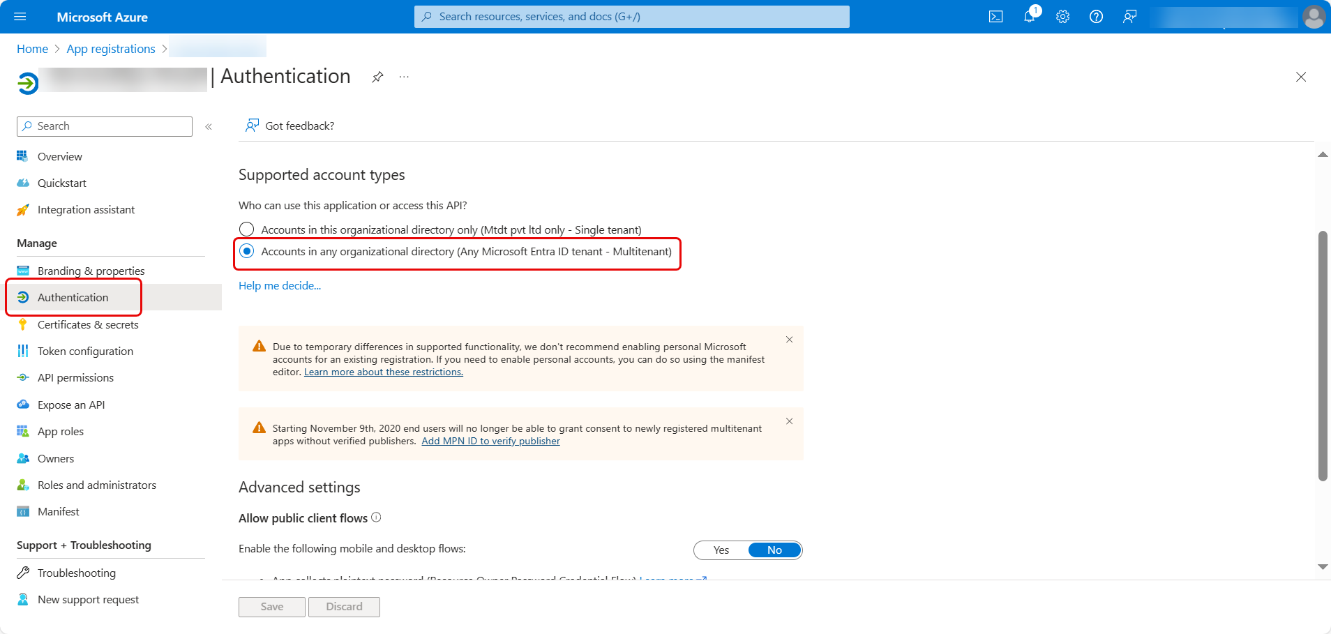 Step 17: Next, login to the Microsoft Azure portal, navigate to App Registrations > Motadata Virtual Agent > Manage > Authentication tab and enable the "Accounts in any organizational directory (Any Microsoft Entra ID - Multitenant)" field in the Supported account types section.