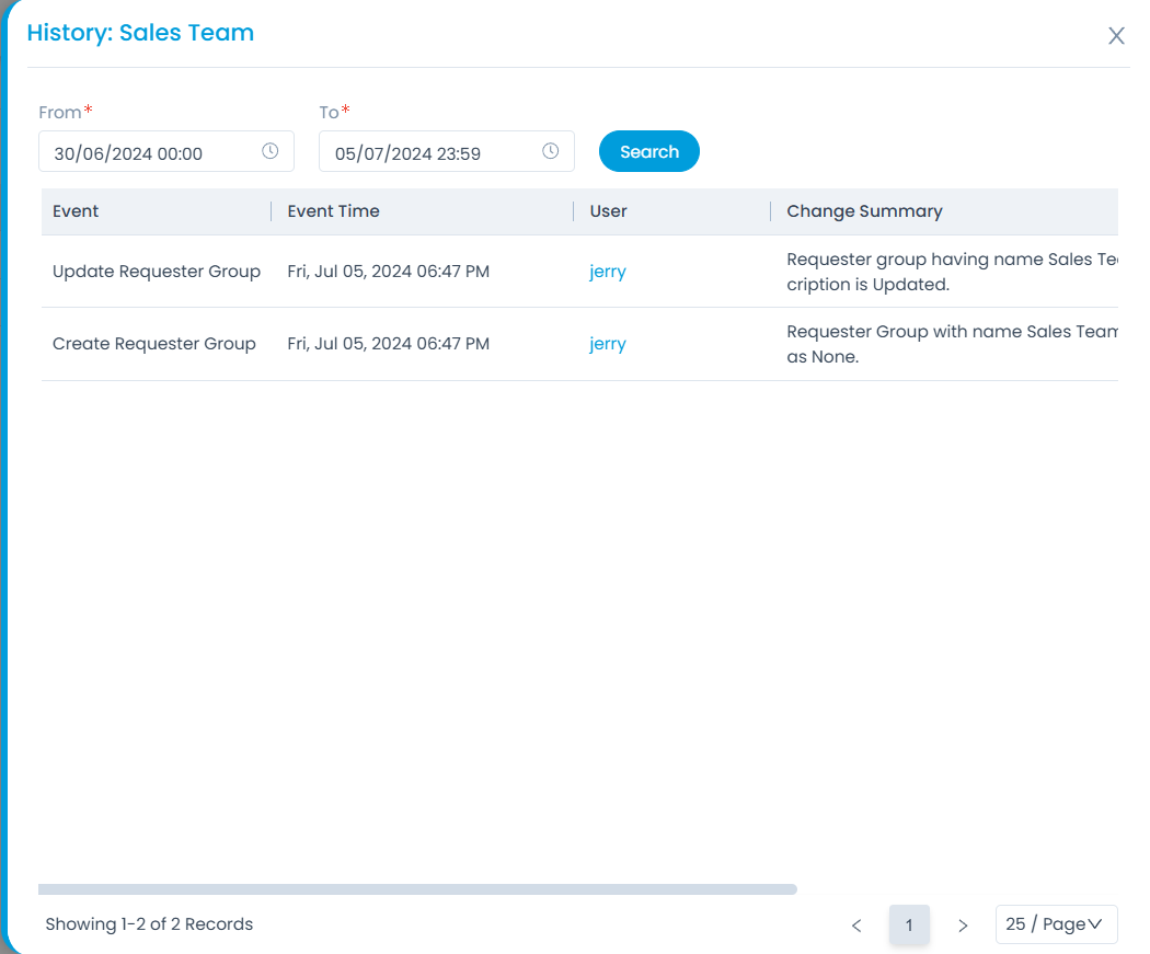 You can view the history of the Requester Group events. One can view the details by clicking the History icon on the Requester Group list page, and the popup will appear.