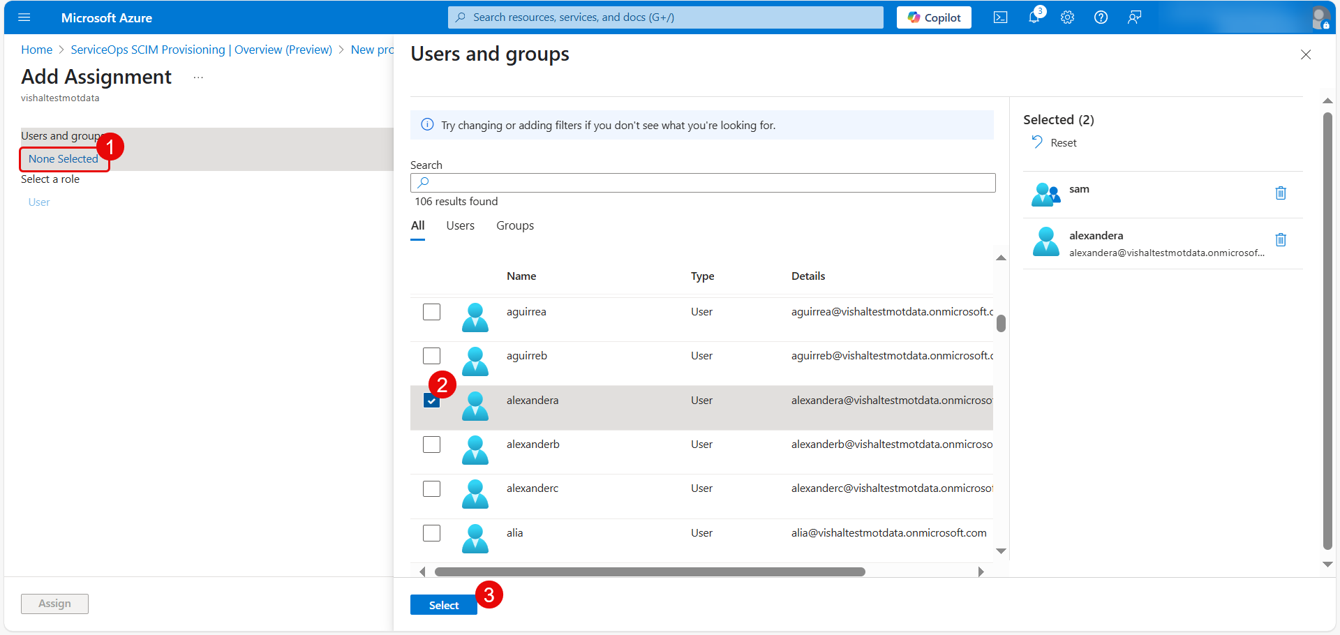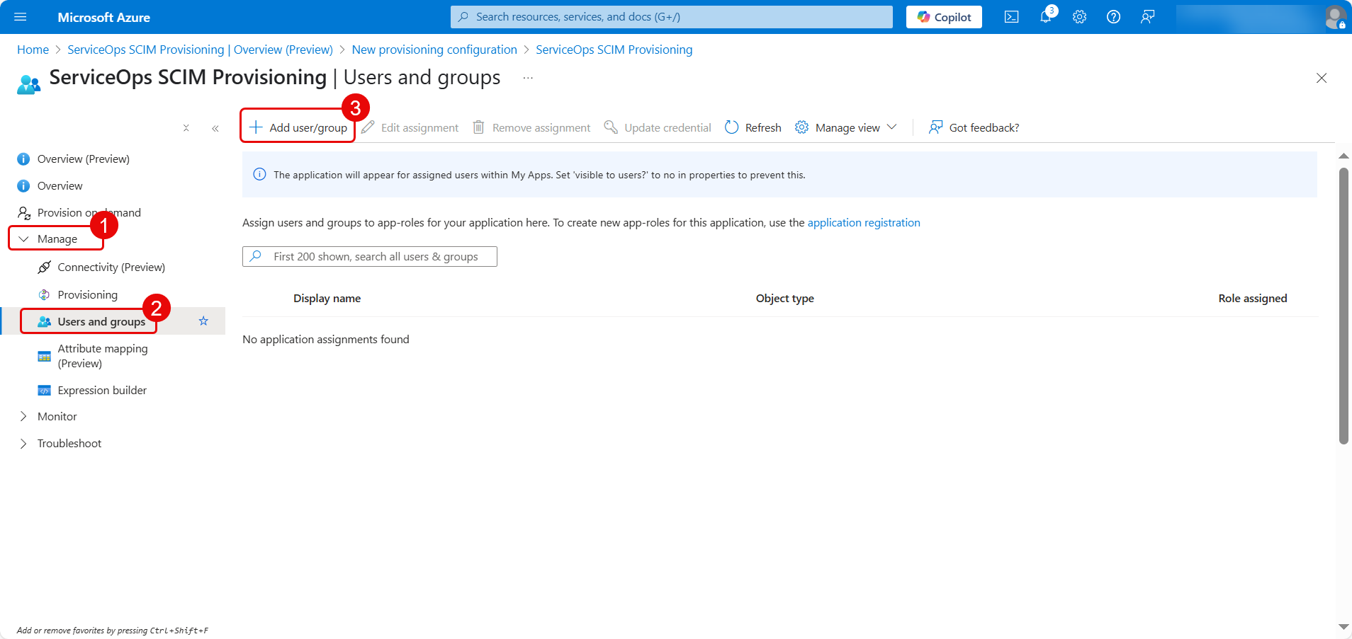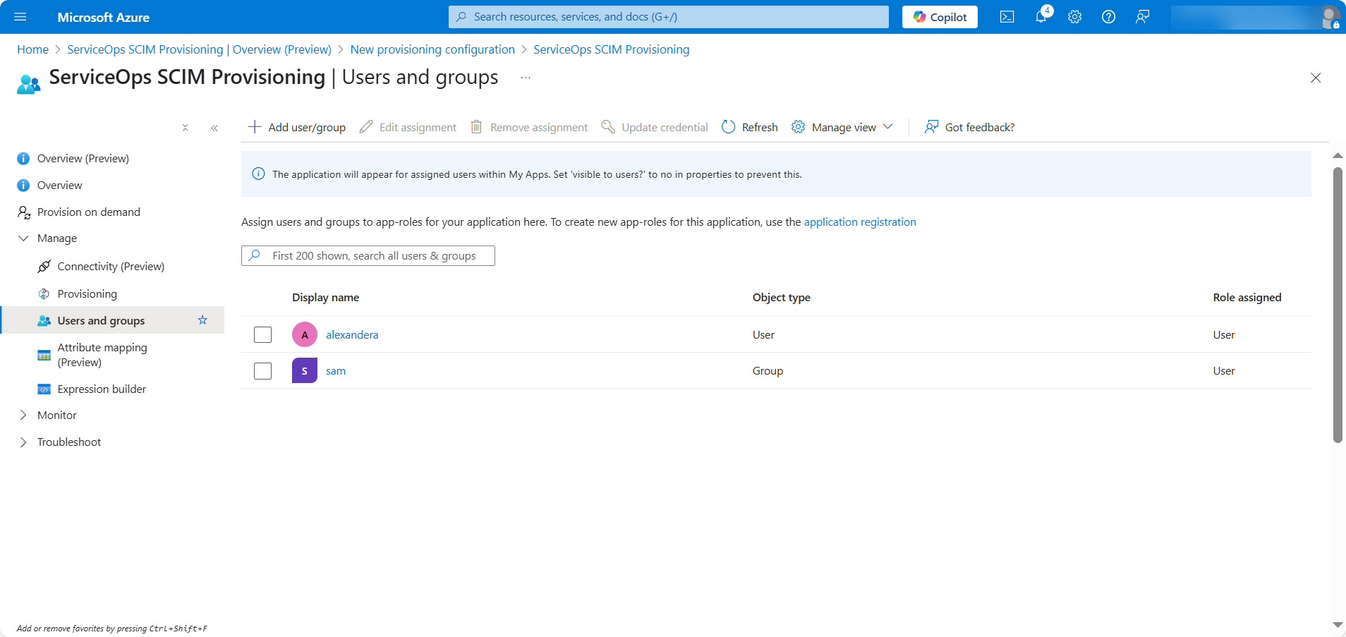 - If your scope is set to "assigned", navigate to the Users and groups tab of your enterprise application in Azure AD and assign the users or groups you wish to provision.