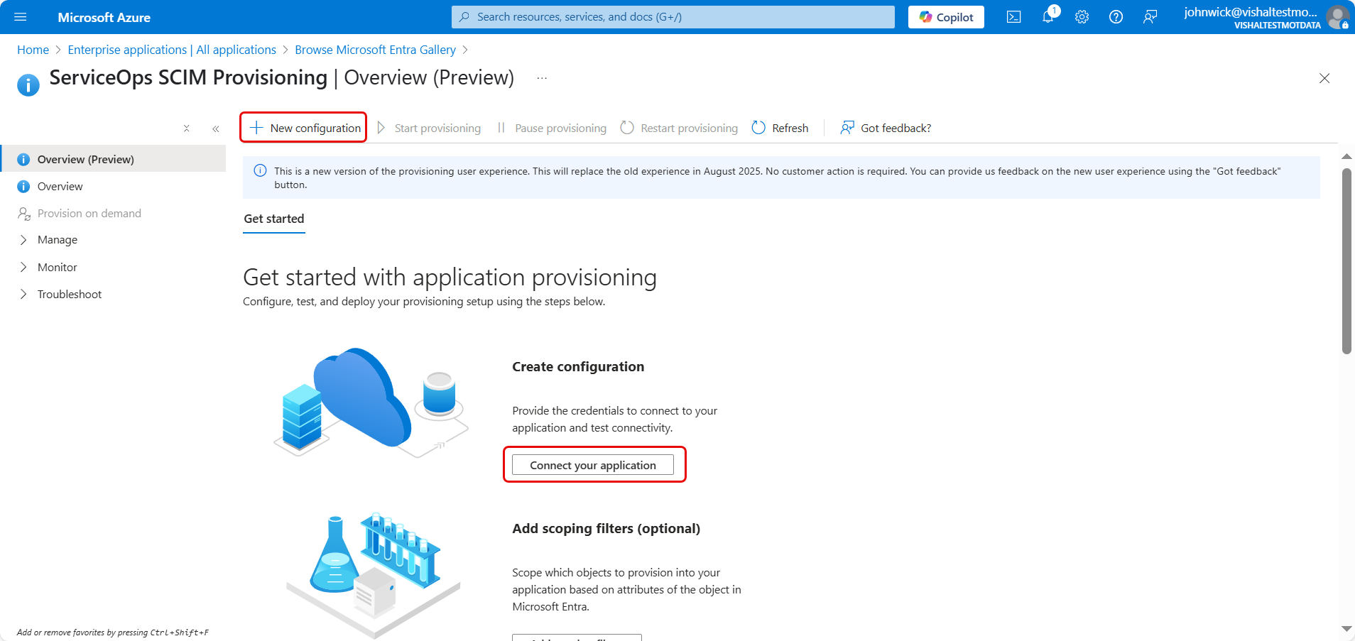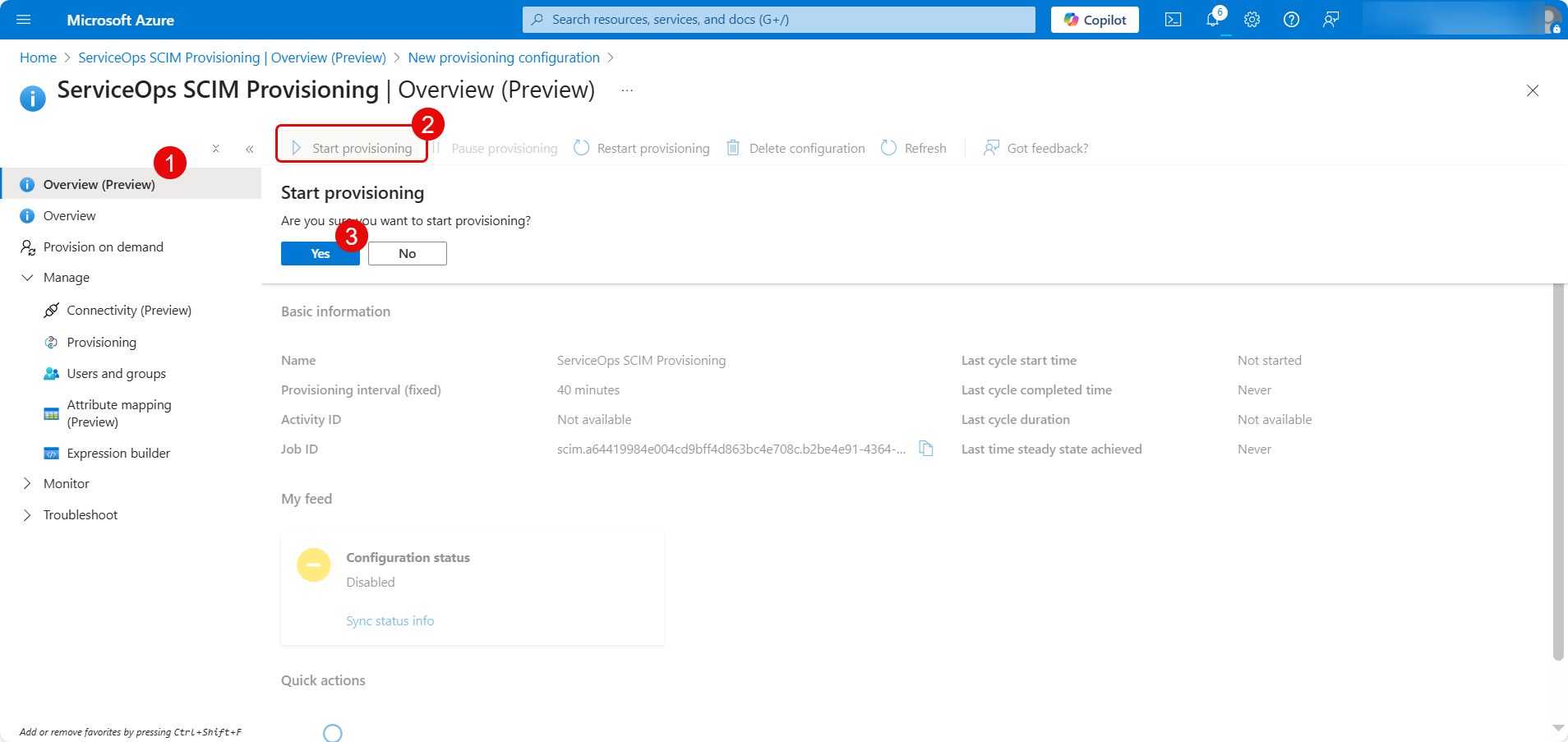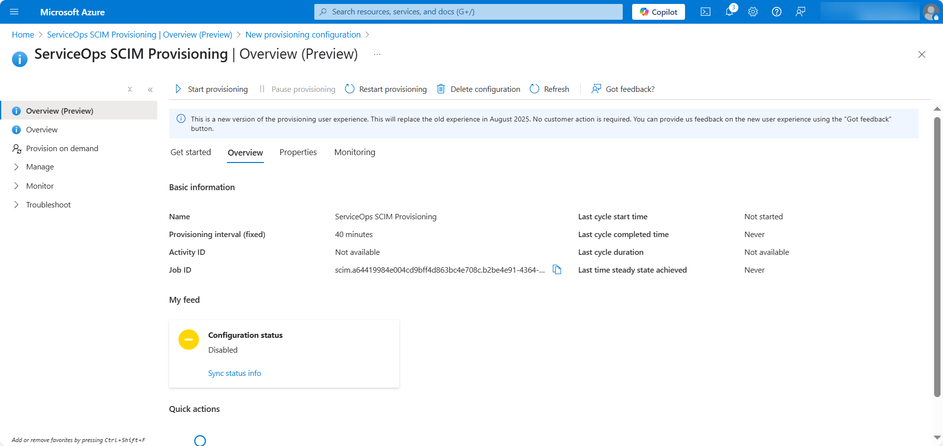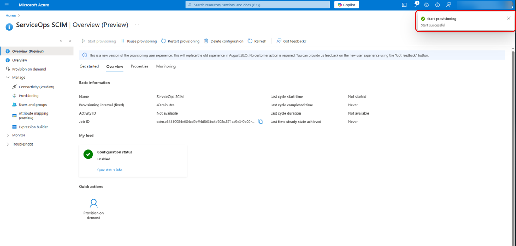 - Navigate to the Overview (Preview) section and click Start Provisioning.