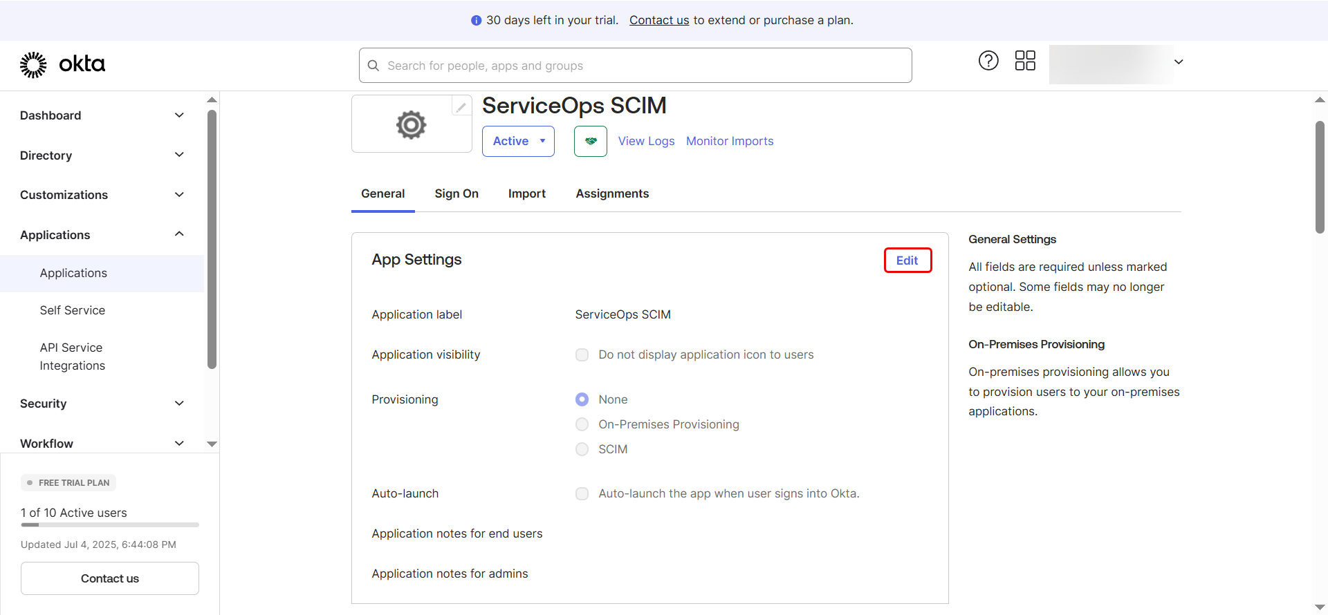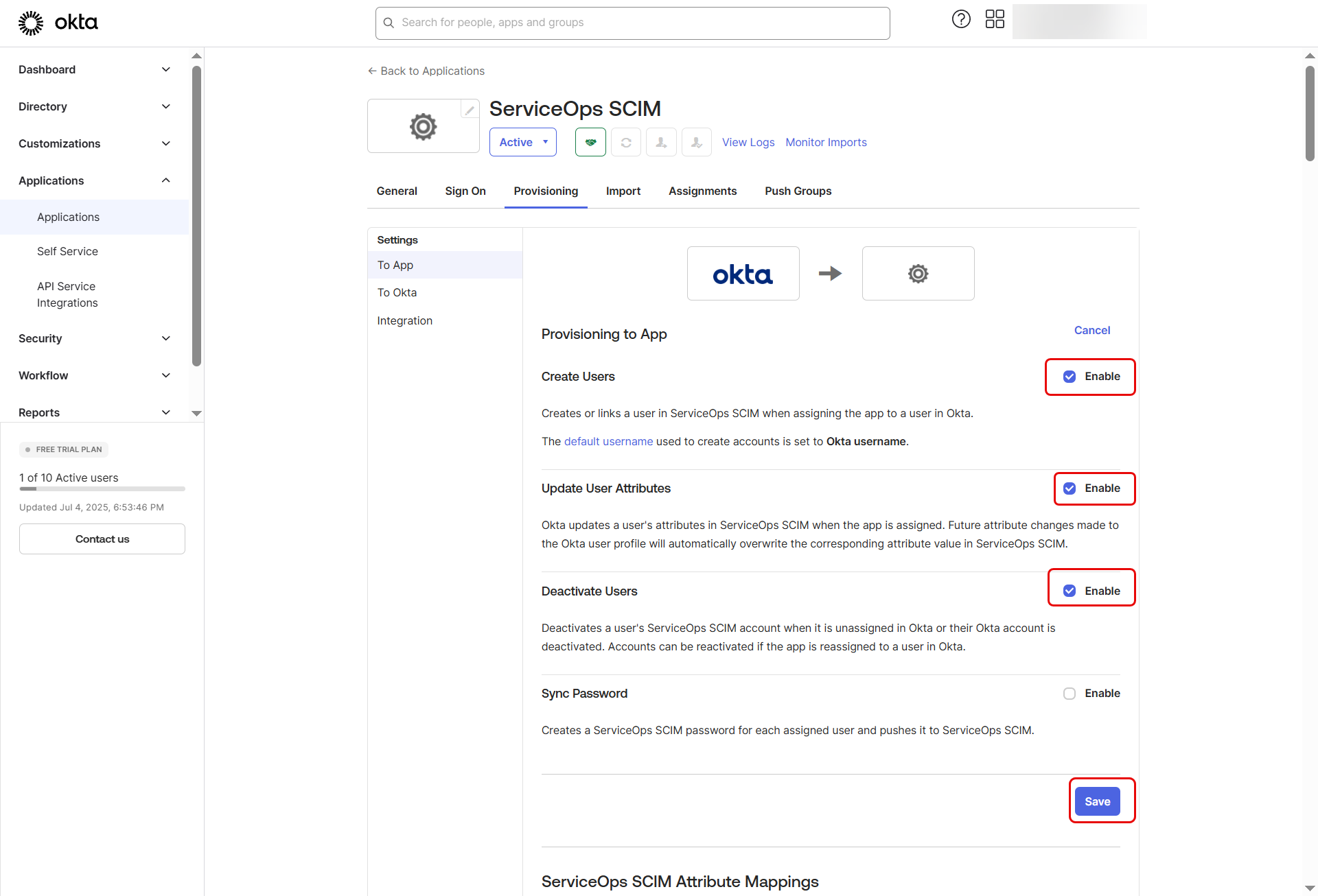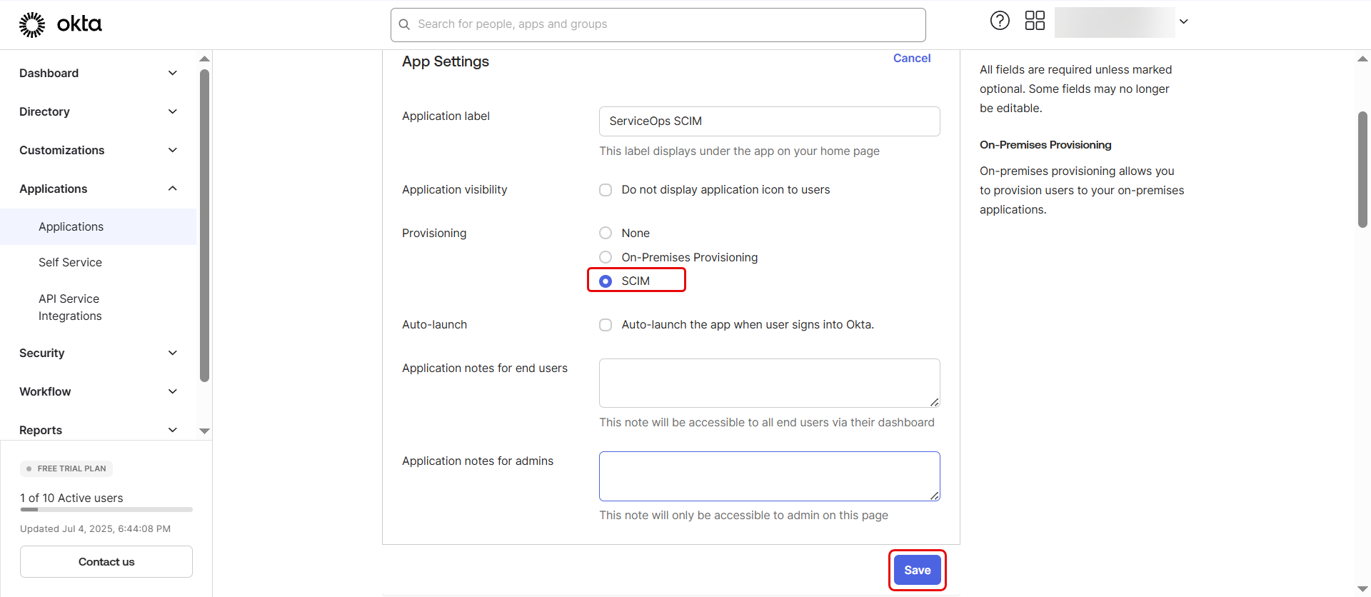This guide outlines how to configure SCIM-based user provisioning in Okta. It assumes you have already obtained your SCIM Endpoint and Authentication Token from the ServiceOps SCIM configuration page.