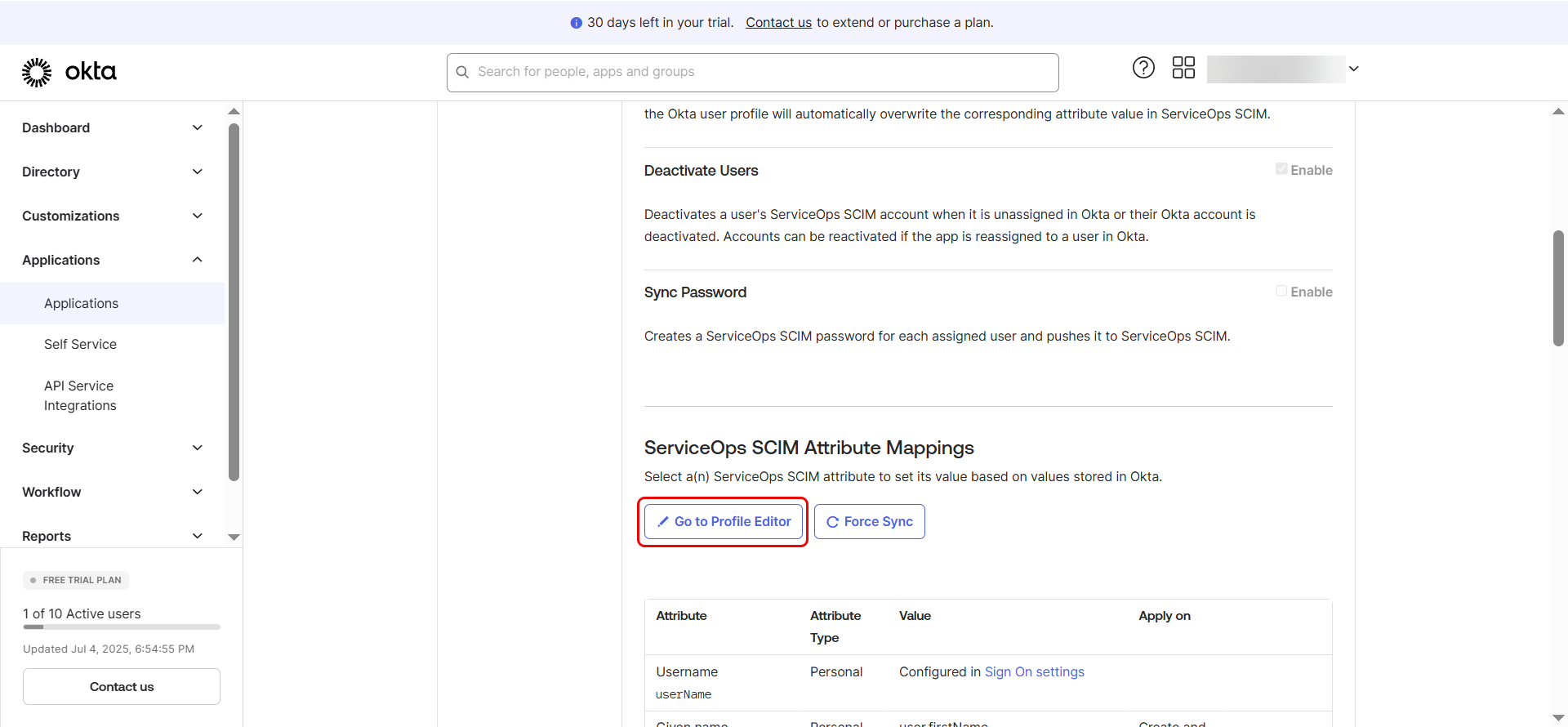 - Under ServiceOps SCIM to Okta user, map appuser.manager field against the managerId of Okta.