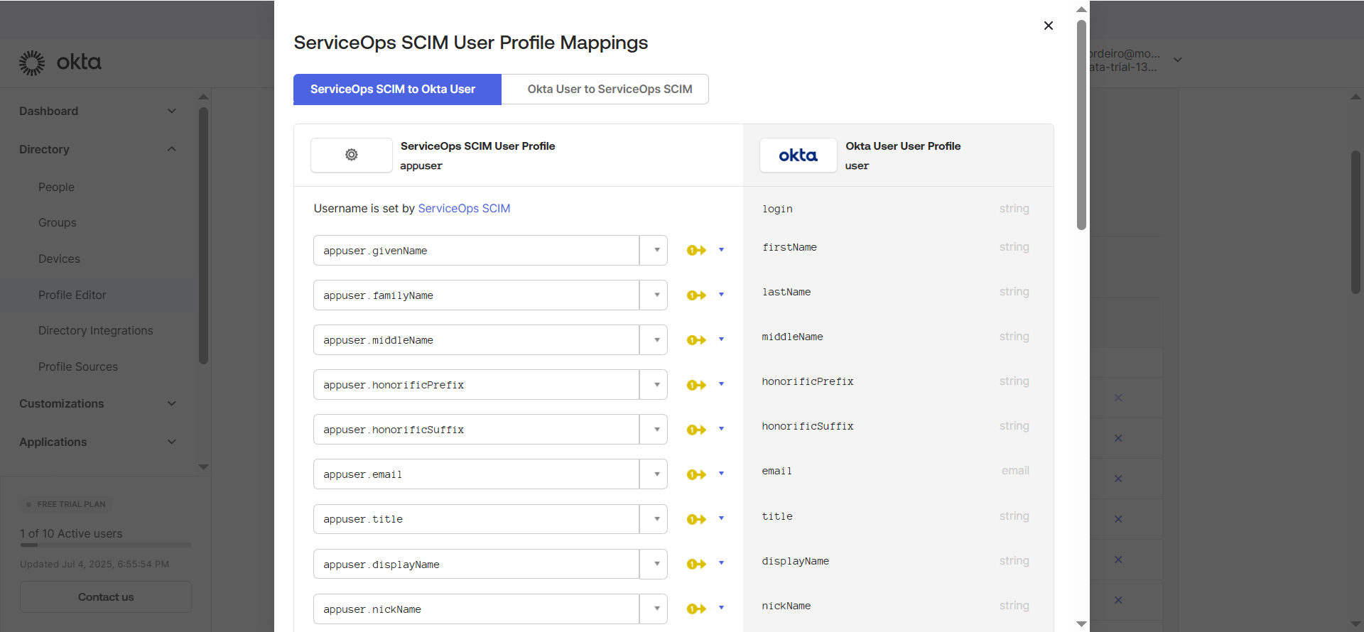 - And also under Okta user to ServiceOps SCIM, link the attributes.