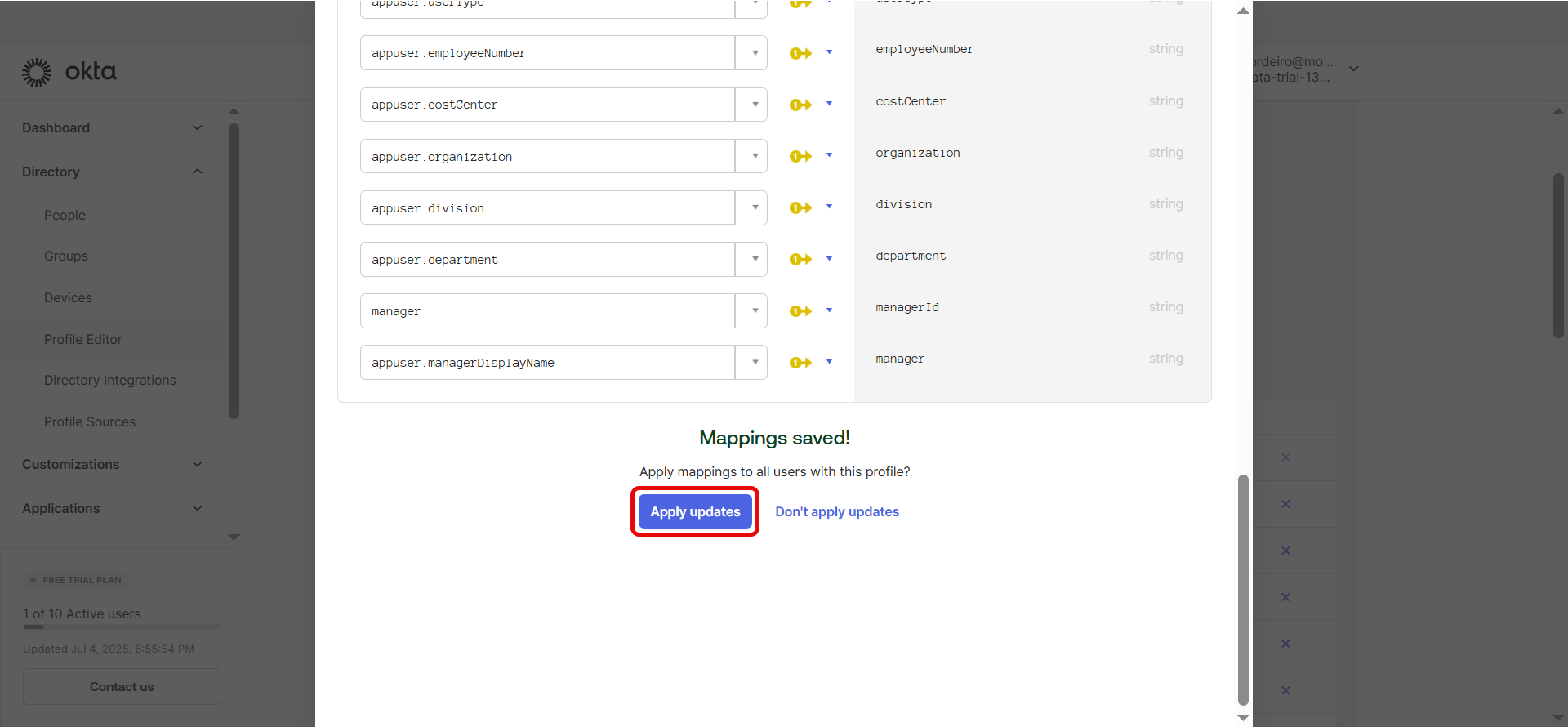 - Always verify after saving that the mappings display the correct links between Okta fields and ServiceOps fields.