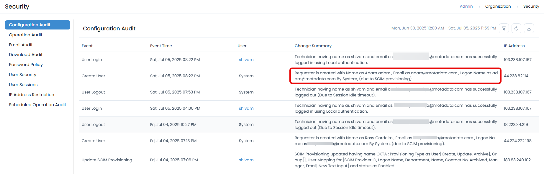 Now, log in to ServiceOps to verify that users and groups are created or updated as expected. For example, here Adam user is created through SCIM provisioning from Okta. Provisioning updates from Okta to ServiceOps via SCIM are processed almost instantaneously, ensuring near real-time user and group synchronization.