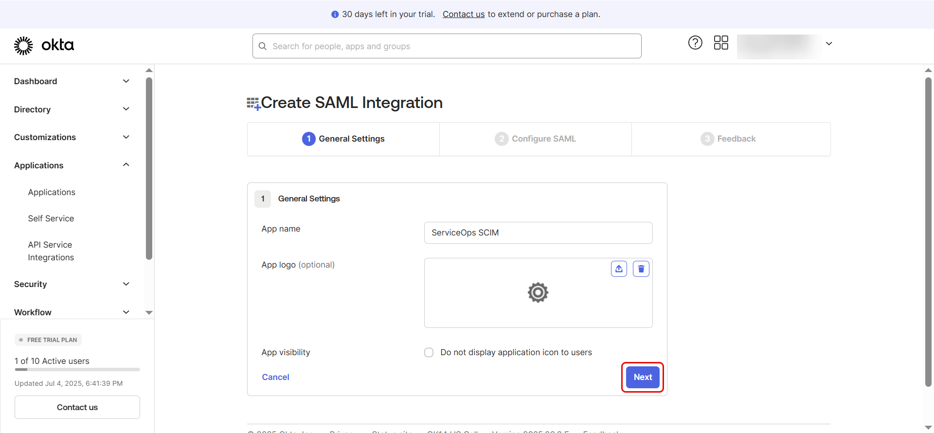 ServiceOps SCIM), optionally upload a logo, and click Next.