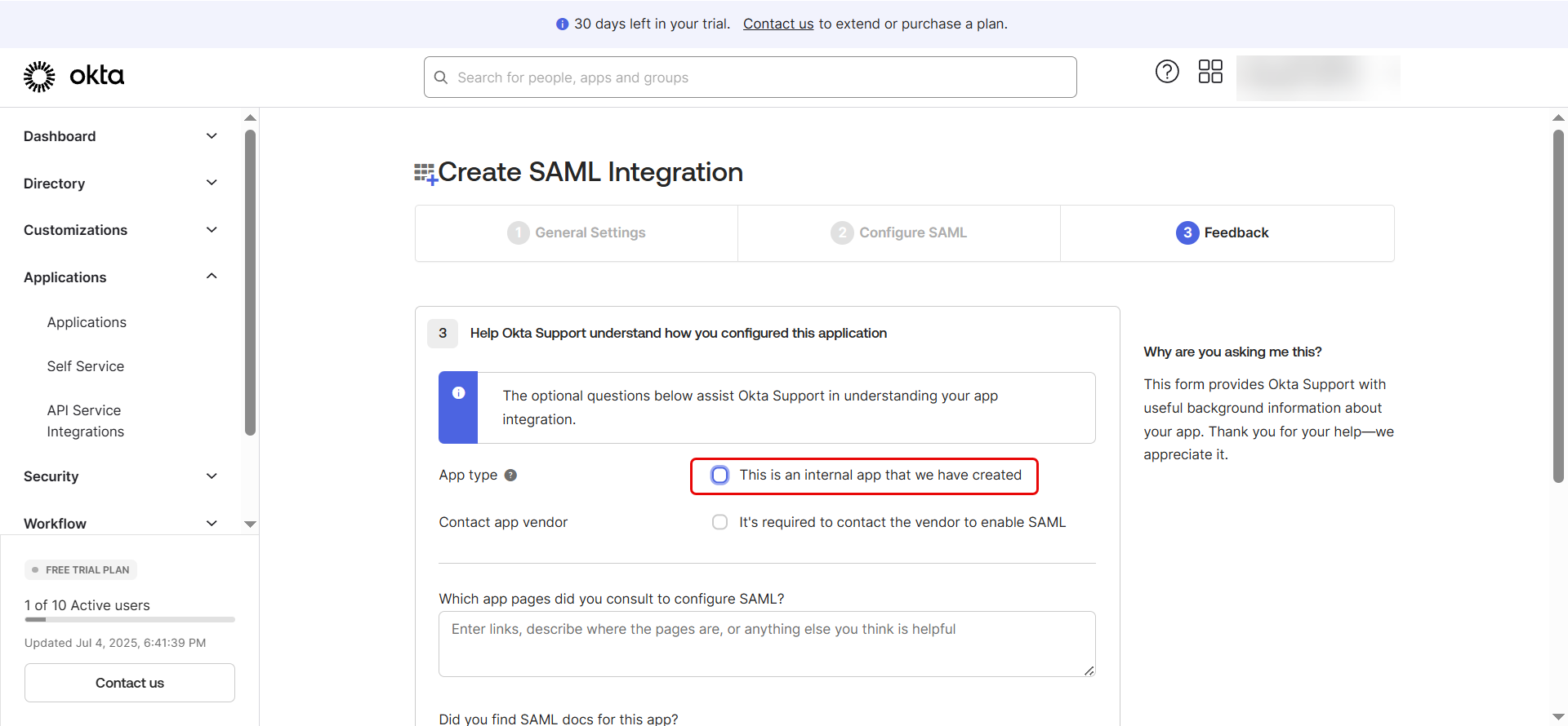 Next, above the Integration tab, To App and To Okta tabs will appear.