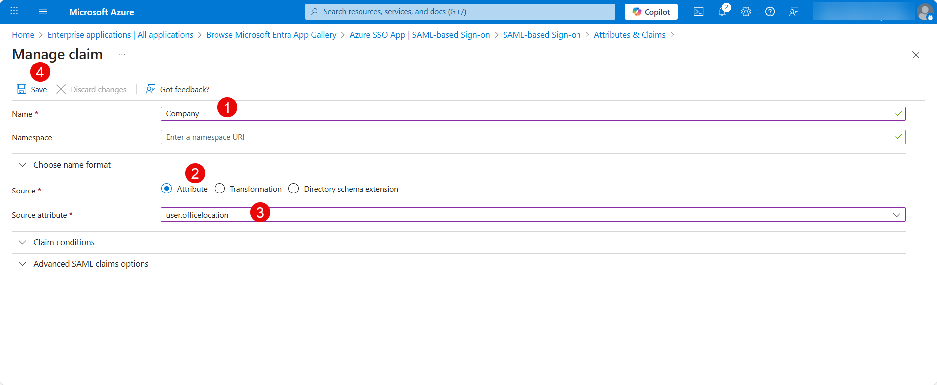 - Edit the Attributes & Claims and add a new claim for mapping the field with the ServiceOps field. Here, Company field is mapped.