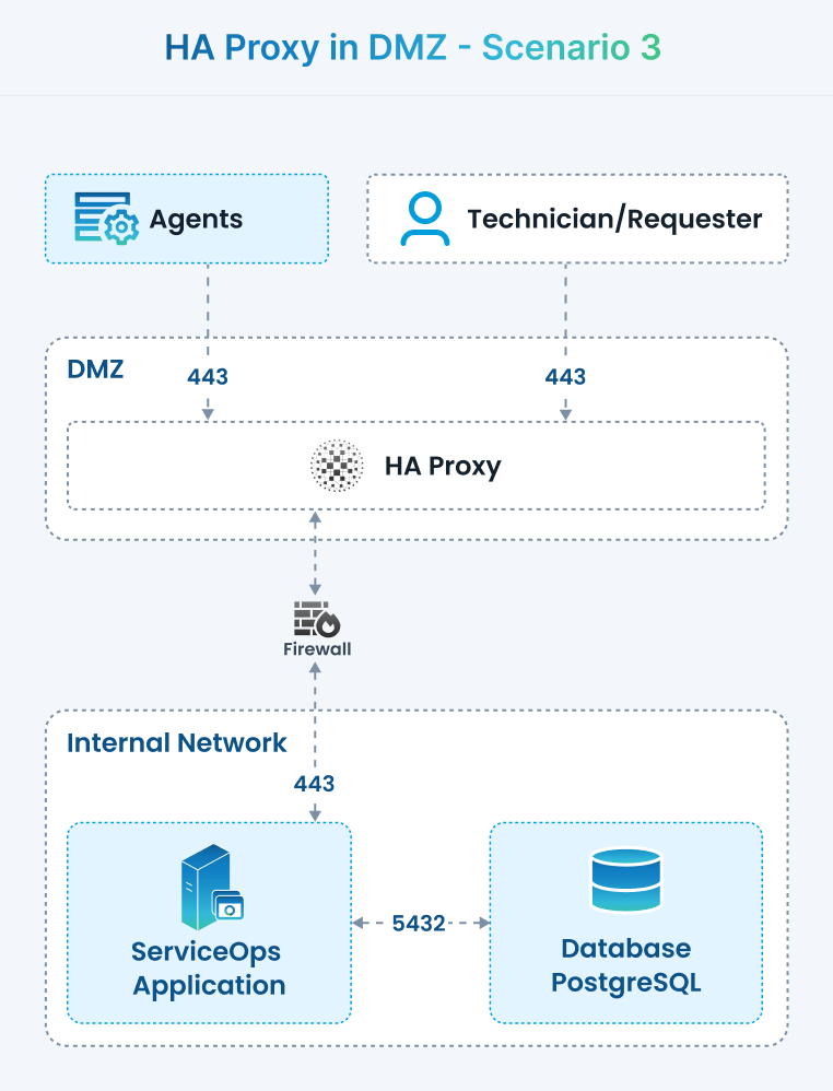 Scenario 3 — HAProxy in DMZ; ServiceOps App and DB on separate servers in Secured Network