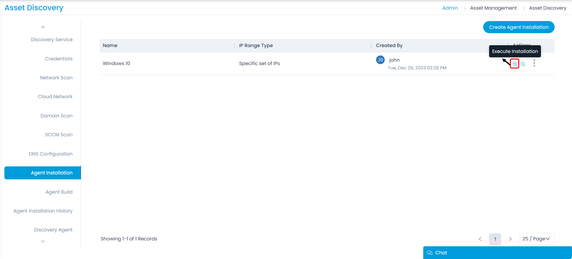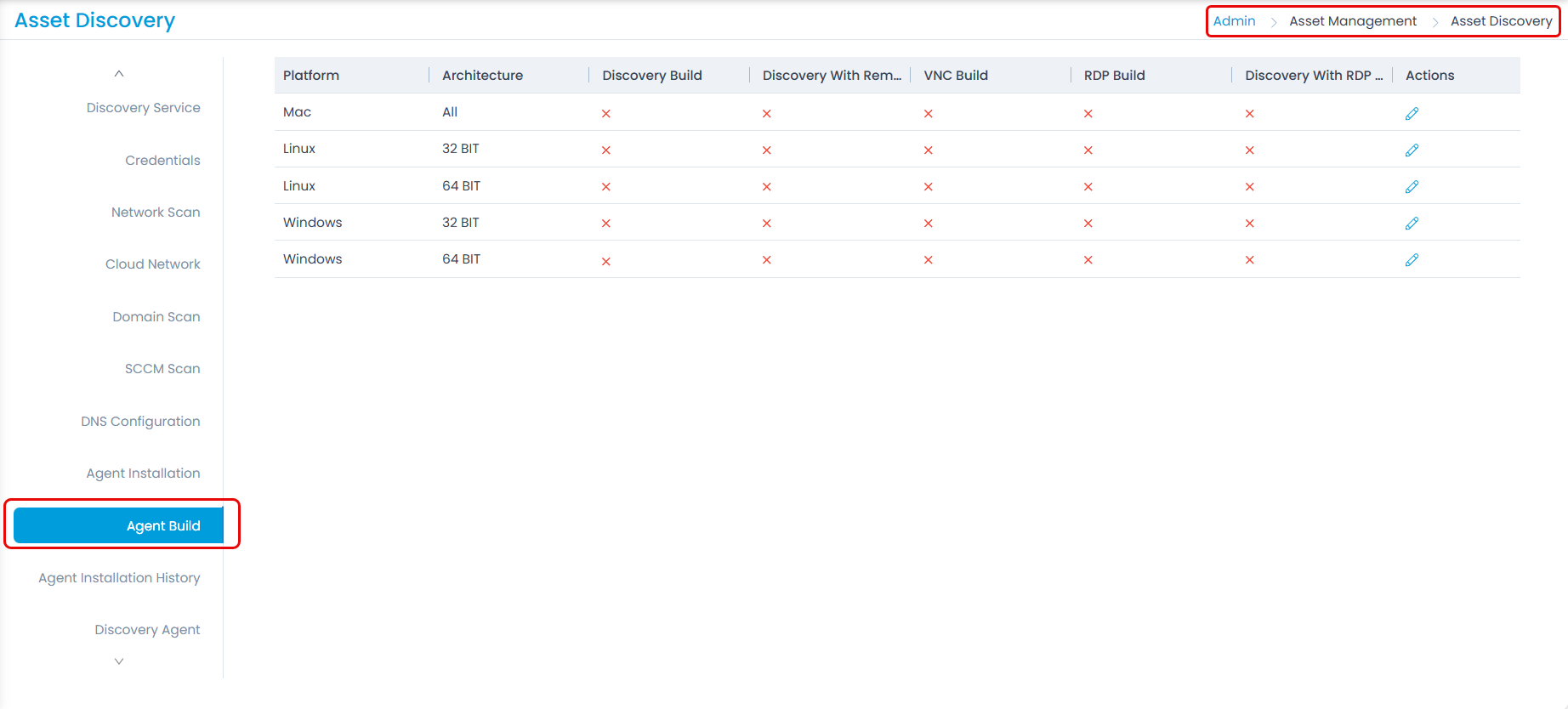 - Go to the Admin > Asset Management > Asset Discovery > Agent Build tab.
