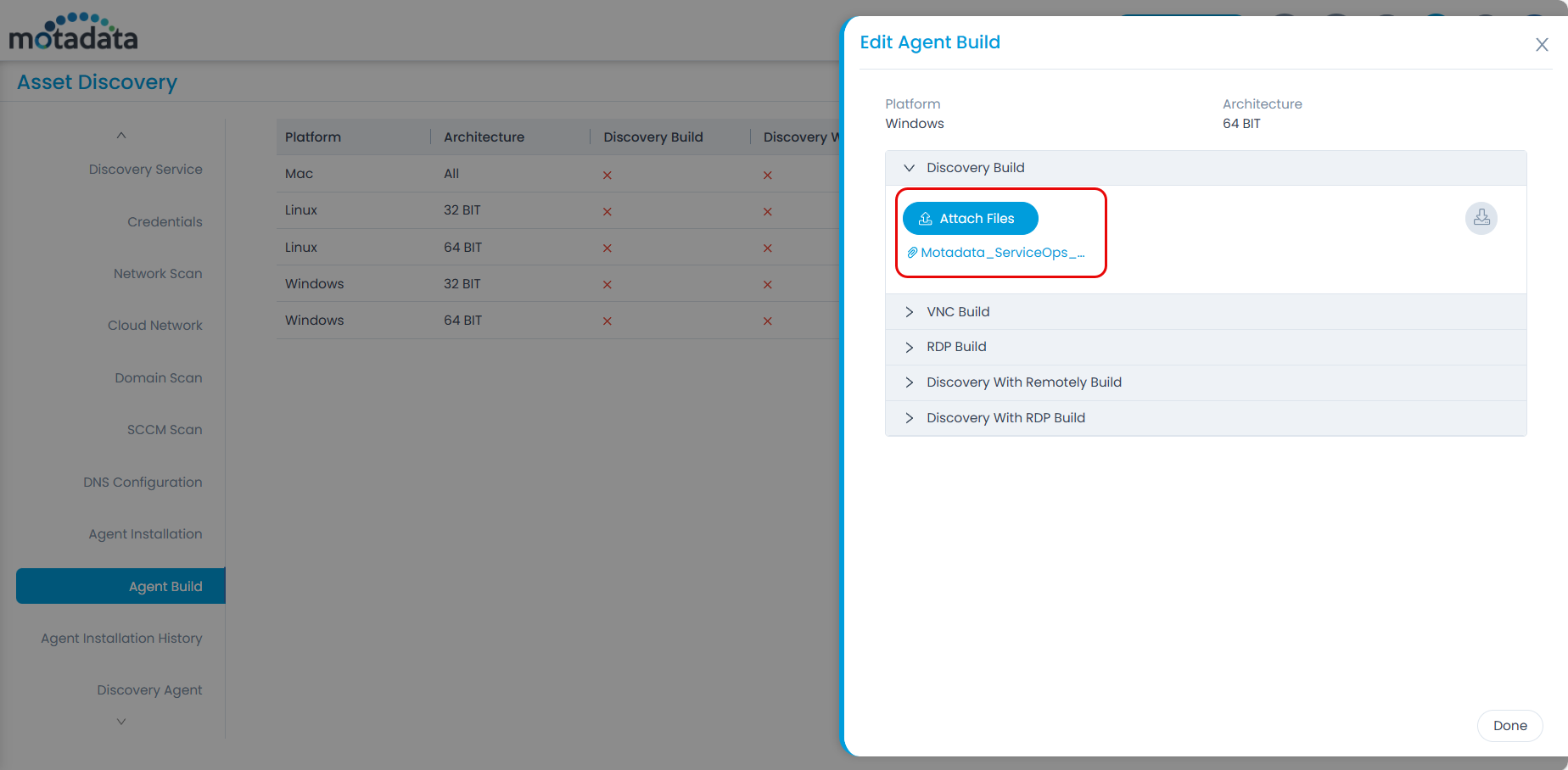 - Select the required option and upload the required agent build. Here, Windows Discovery Build is uploaded. Ensure that the agent build used is neither the pre-configured build nor downloaded from here.