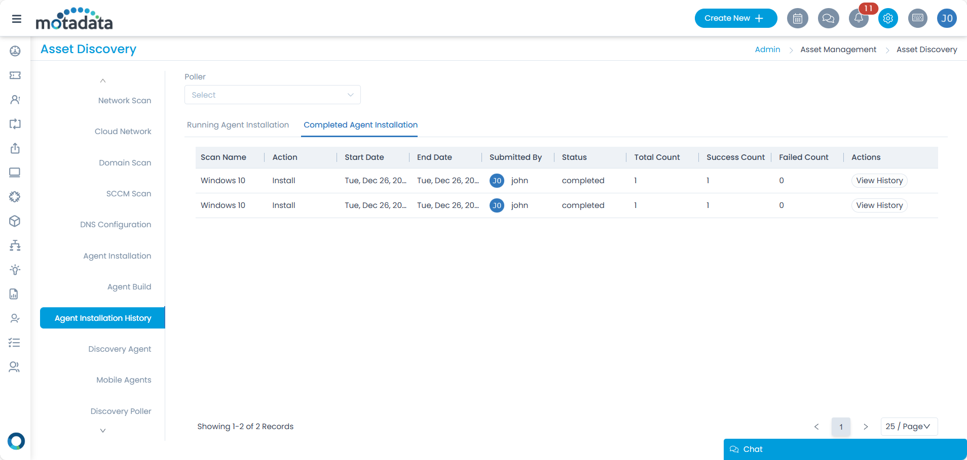 - Once the installation starts, its status will appear in the Agent Installation History tab. Once completed, the agent will be installed in the target machines.