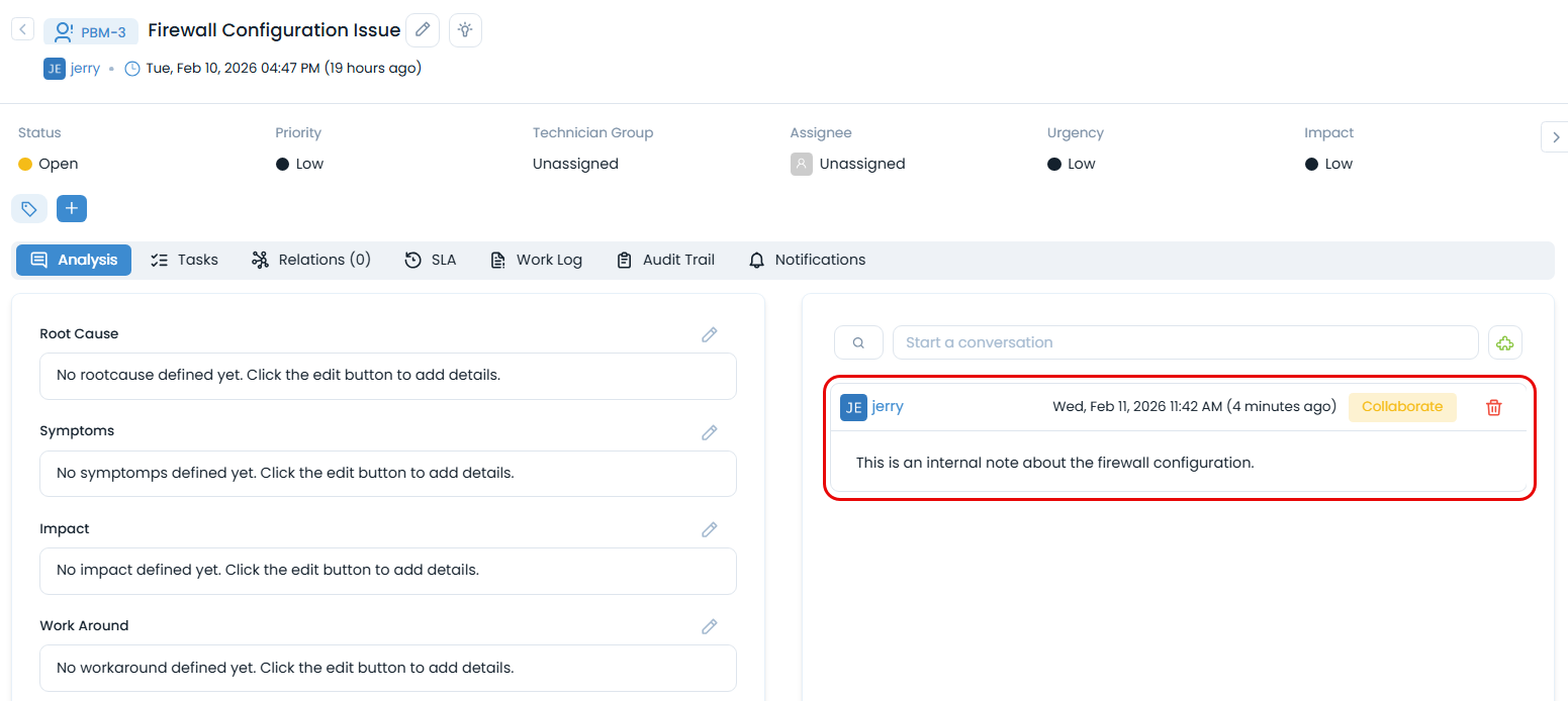You can create a conversation within a Problem ticket by calling the above endpoint with the problem ID.