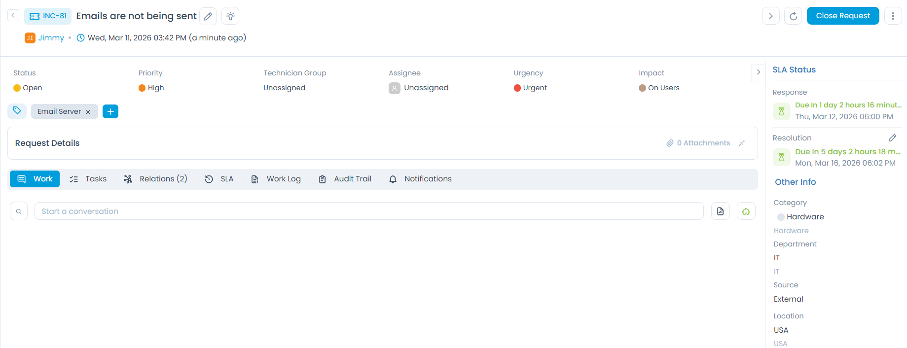 | urgencyName | String | Marks the request as urgent. Possible values are: Low, Medium, High, or Urgent. |