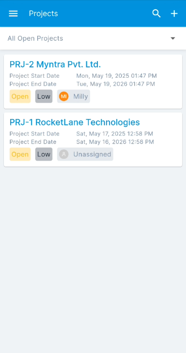 - To add a project, tap the plus (+) icon and the following screen appears.