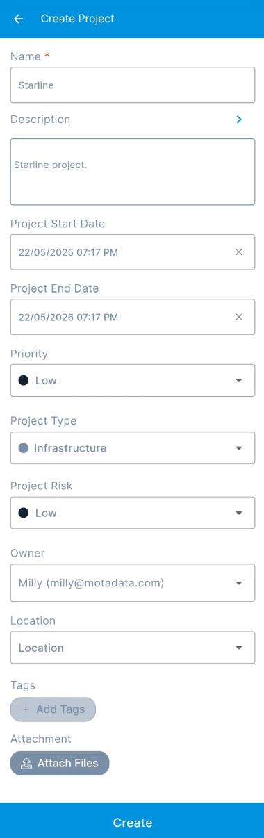 Once done, tap Create and the project gets created successfully. Also, an email is sent to you acknowledging the project. A project starts with a suffix "PRJ". For example: PRJ-1.
