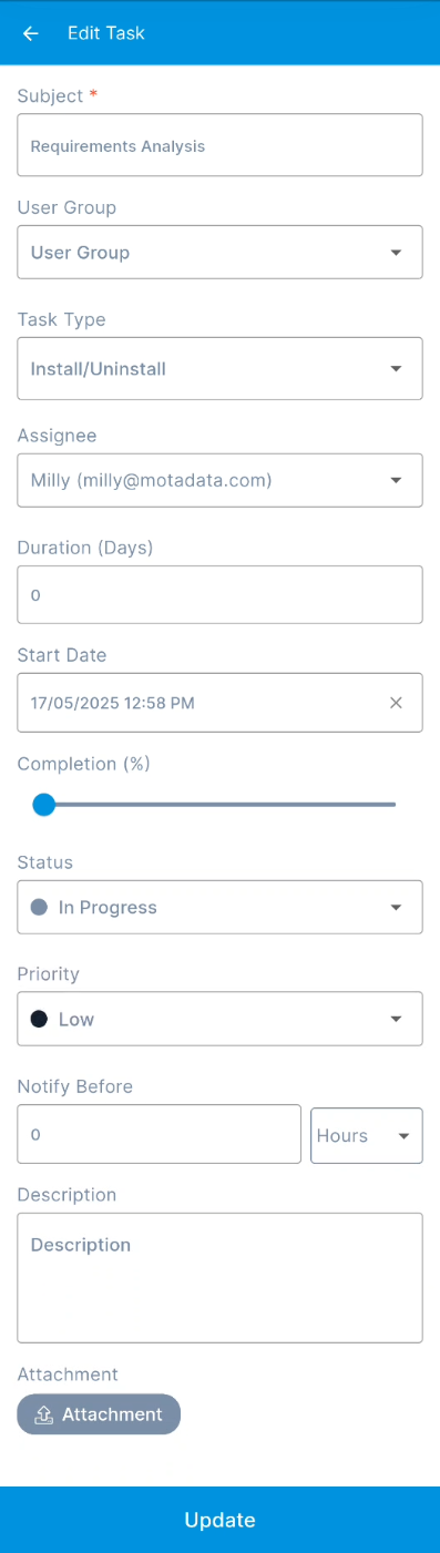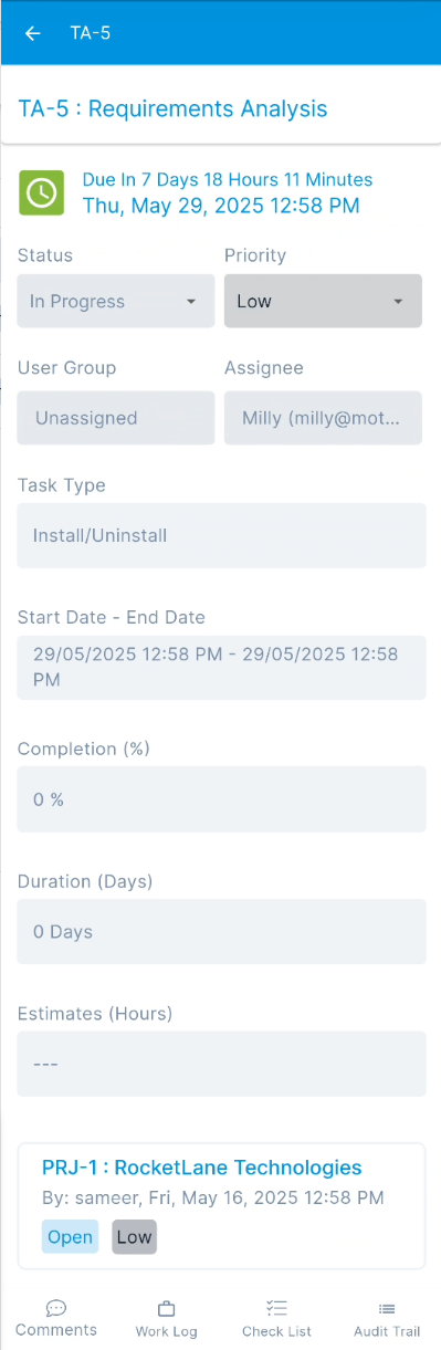 - Edit Task: Tap the edit icon to update the project task details.